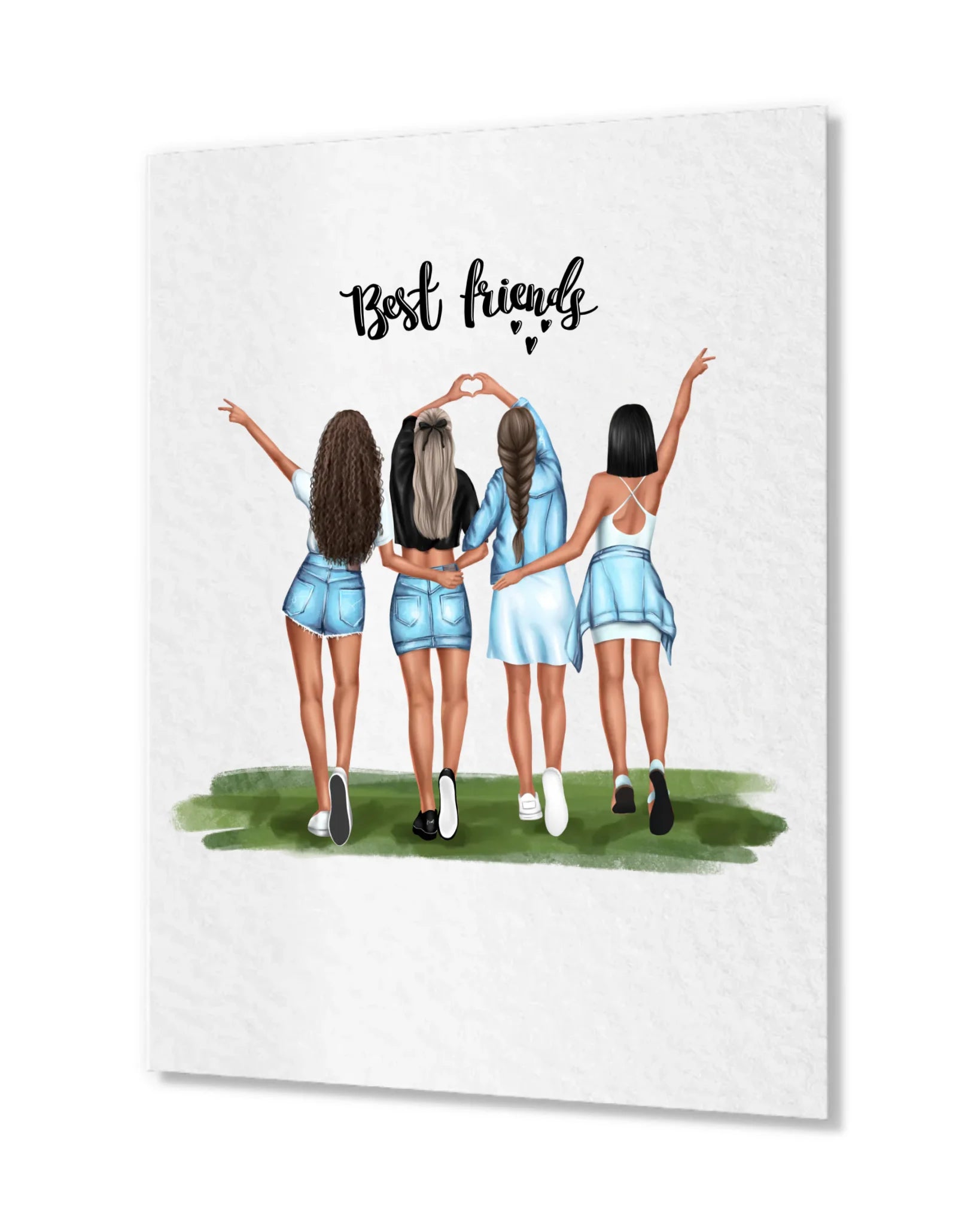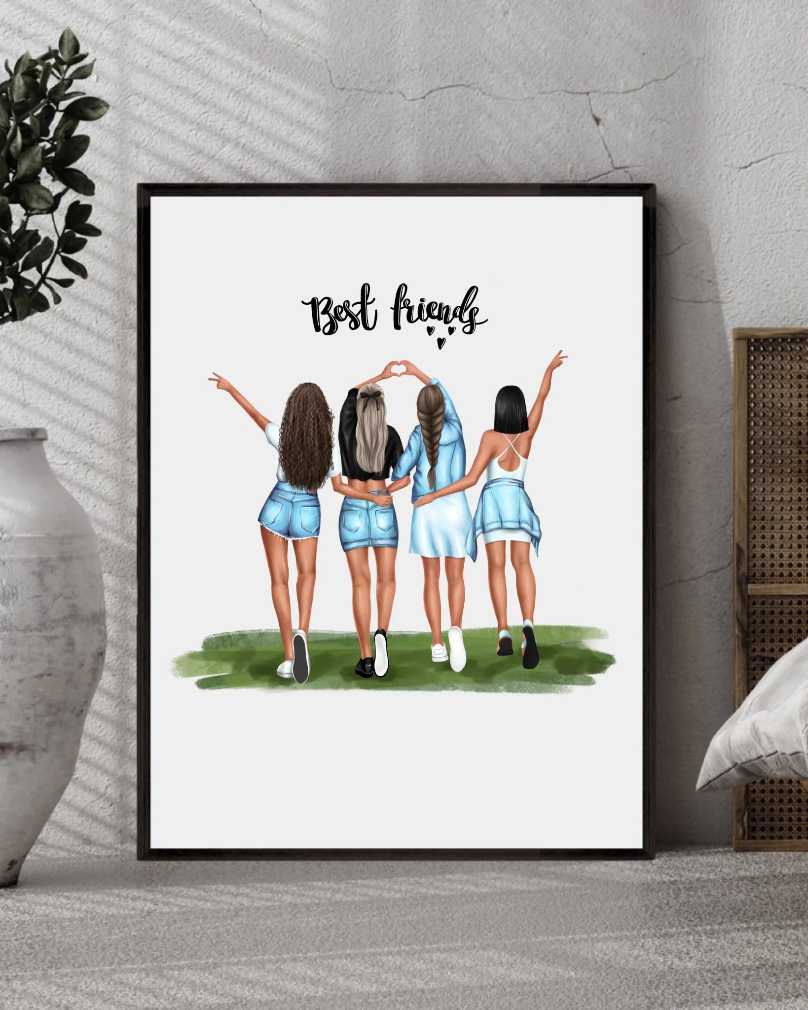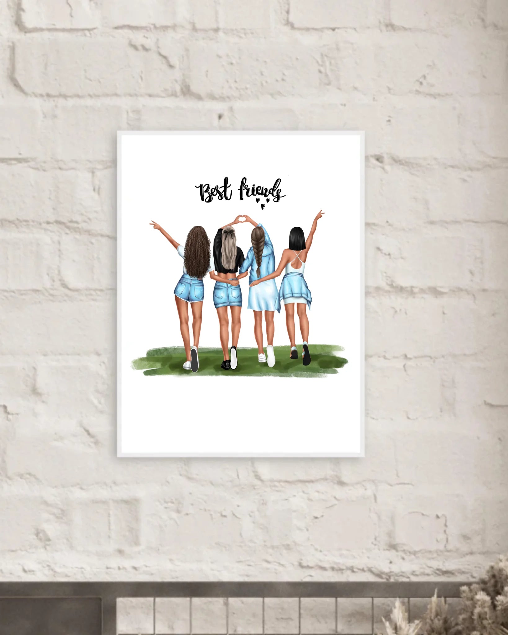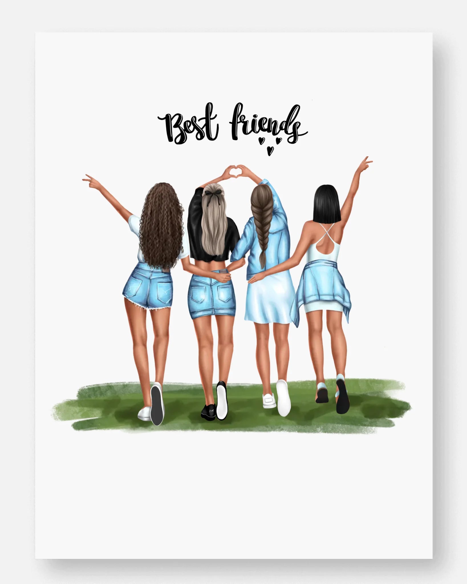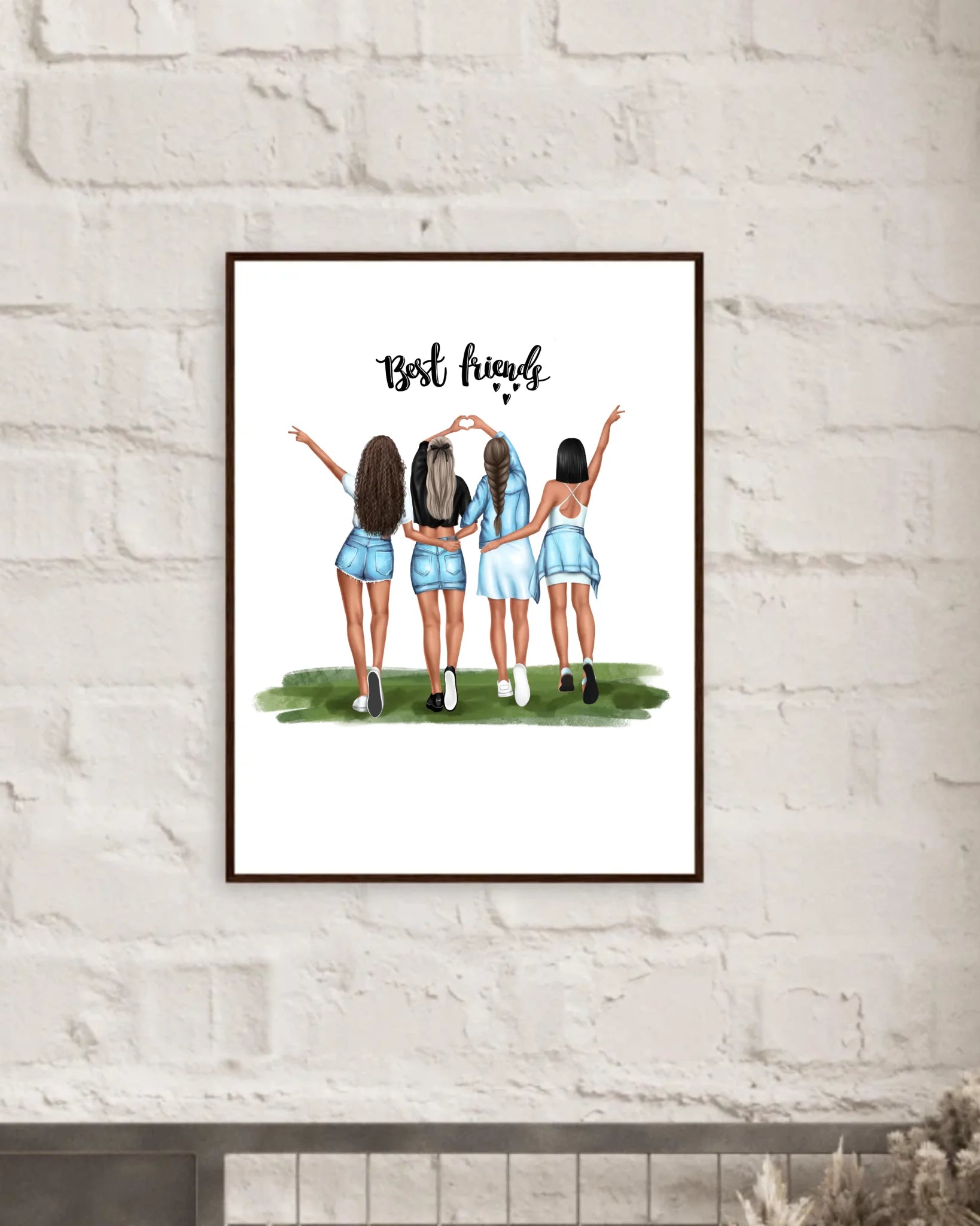 Dieses wunderschöne Poster zeigt vier beste Freundinnen Seite an Seite - individuell gestaltbar, mit Hautfarbe, Frisur, Outfit und auf Wunsch sogar mit Rucksack. Ein echtes Statement für Zusammenhalt, Abenteuer und unvergessliche Erinnerungen!