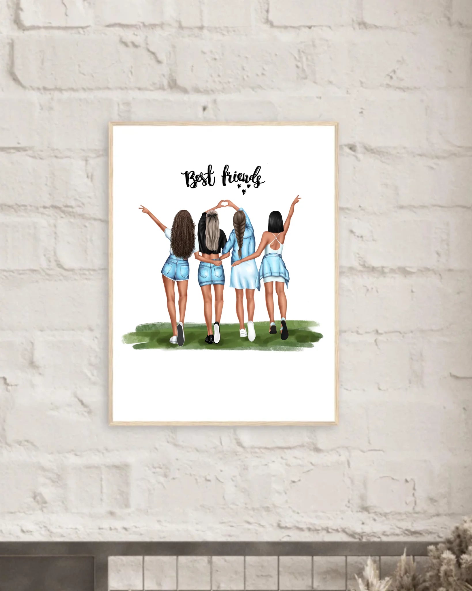 Du kannst für alle vier Freundinnen Haut- und Haarfarben auswählen sowie Frisuren, Outfits und Accessoires individuell anpassen. Auf Wunsch können sogar Details wie ein Rucksack integriert werden, damit das Poster genau eure Freundschaft widerspiegelt.