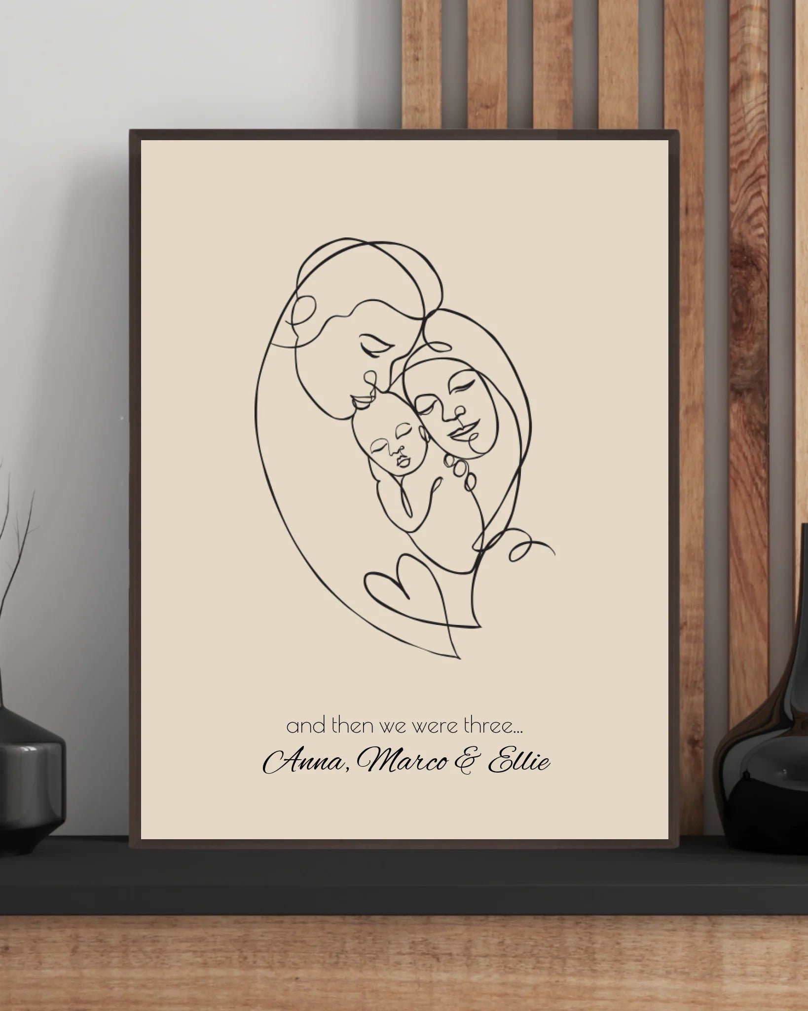 Dieses minimalistische Fineline-Poster fängt die besondere Verbindung zwischen Eltern und Kind auf stilvolle Weise ein. Die kunstvolle Linienzeichnung zeigt Mutter, Vater und Baby in einer liebevollen Umarmung - eingerahmt von einem Herz.