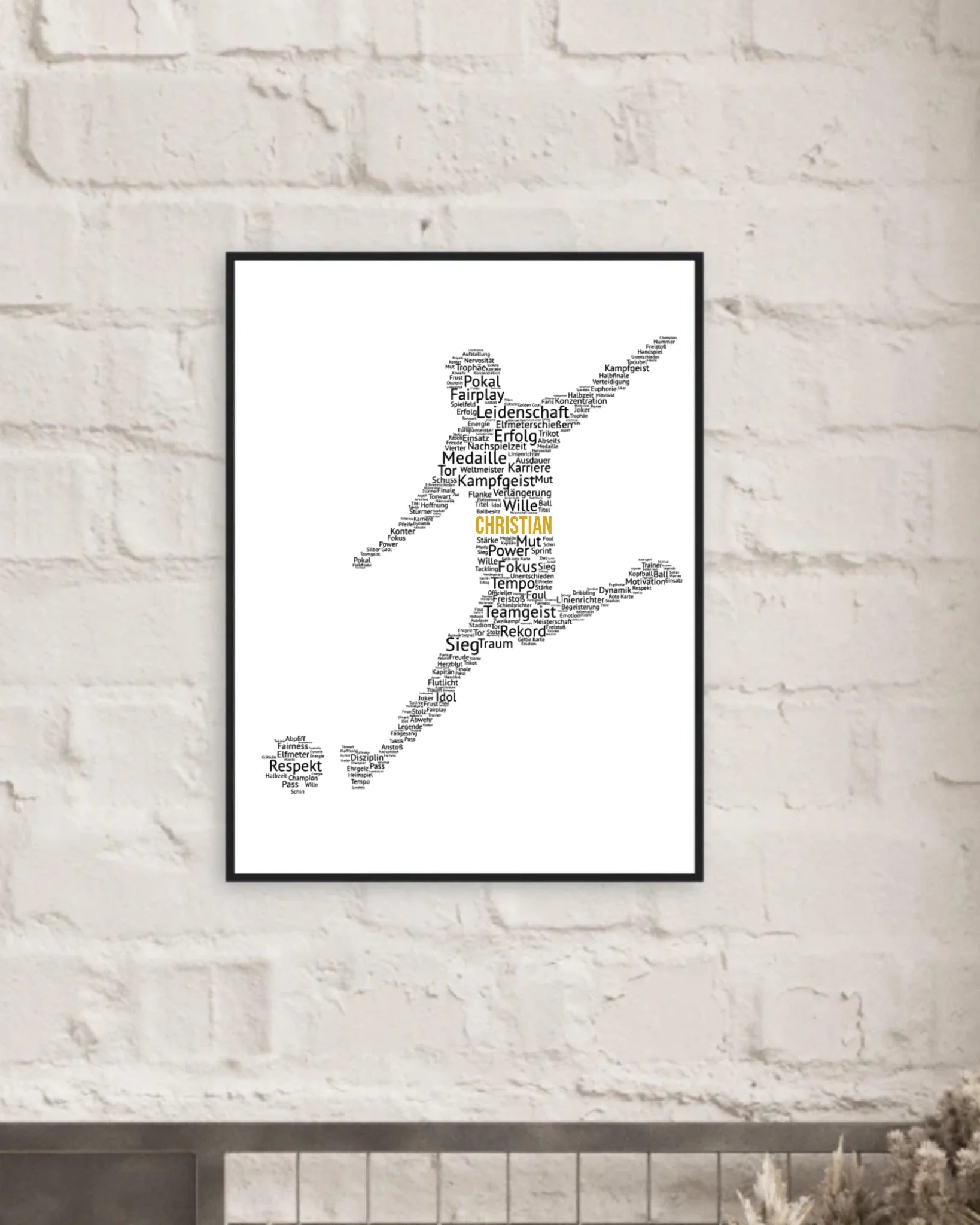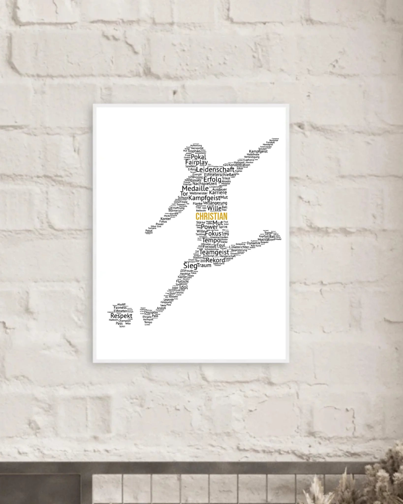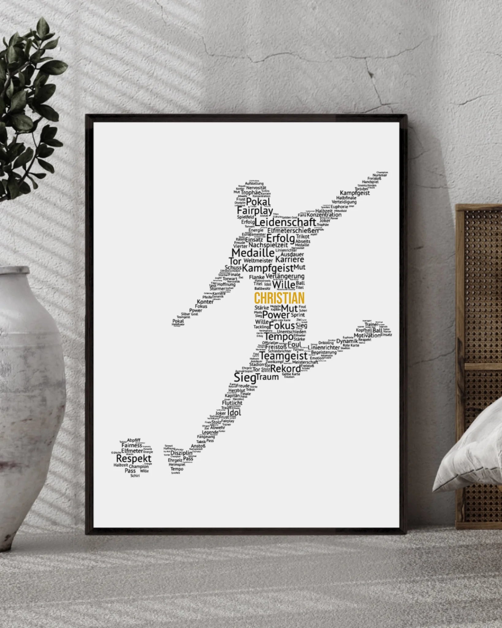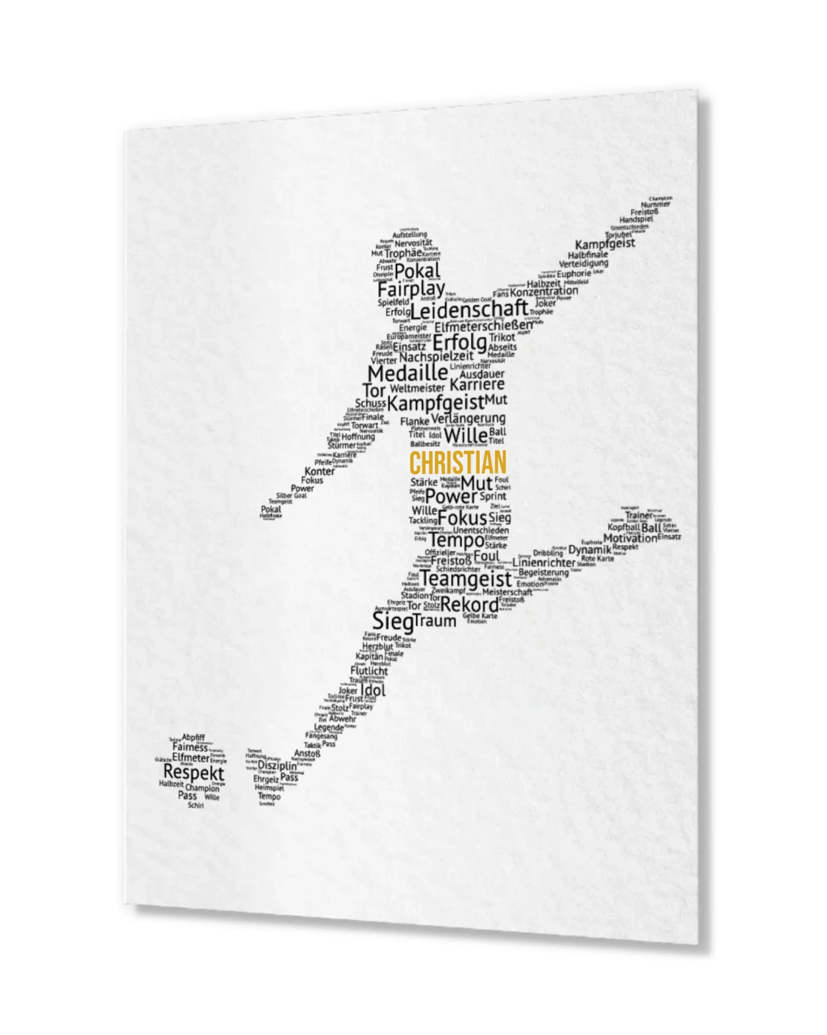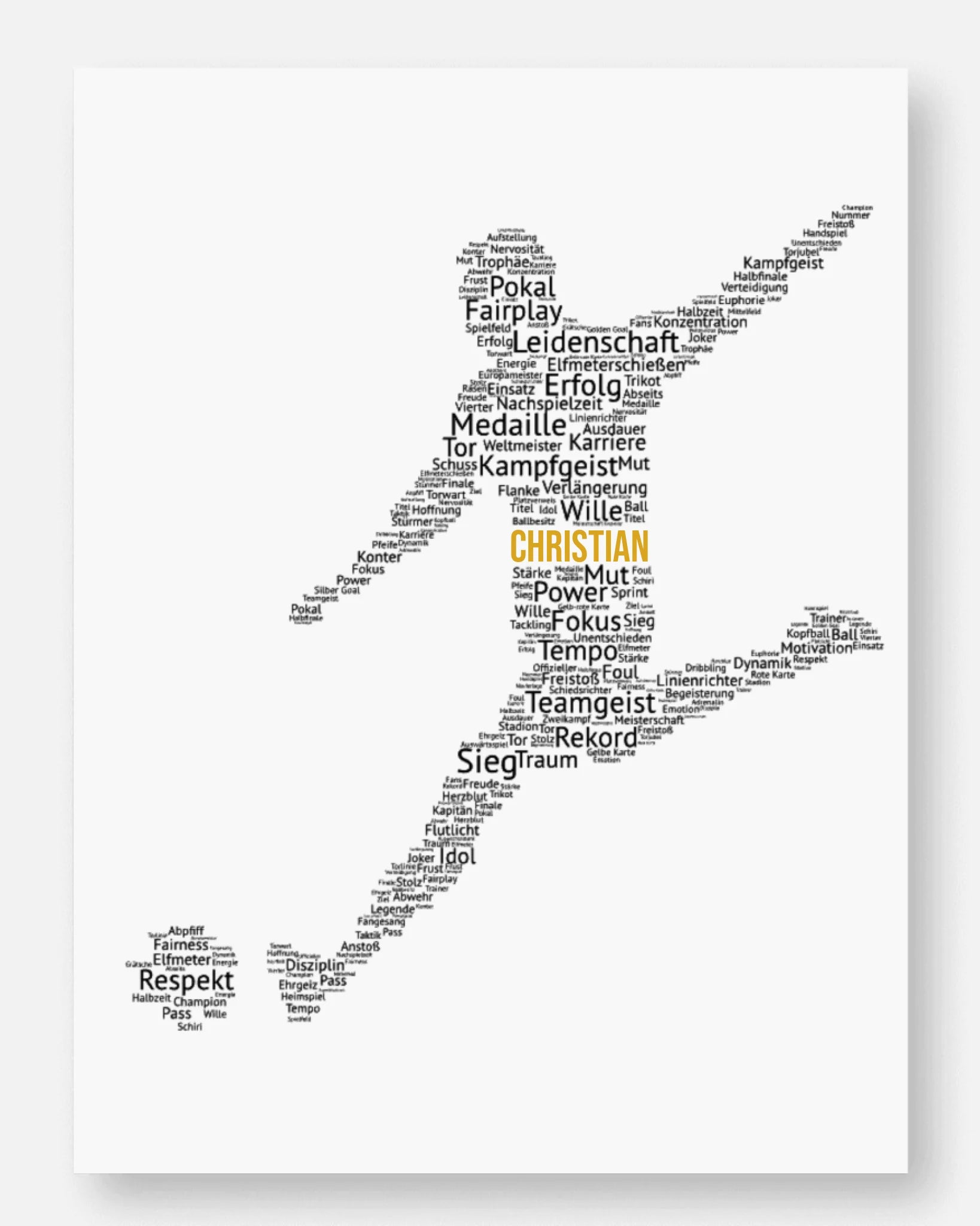 Die Silhouette besteht aus kraftvollen Begriffen rund um den Fußballsport - wie Teamgeist, Leidenschaft und Erfolg. Das moderne Typografie-Design macht das Poster sportlich, individuell und zu einem echten Blickfang.