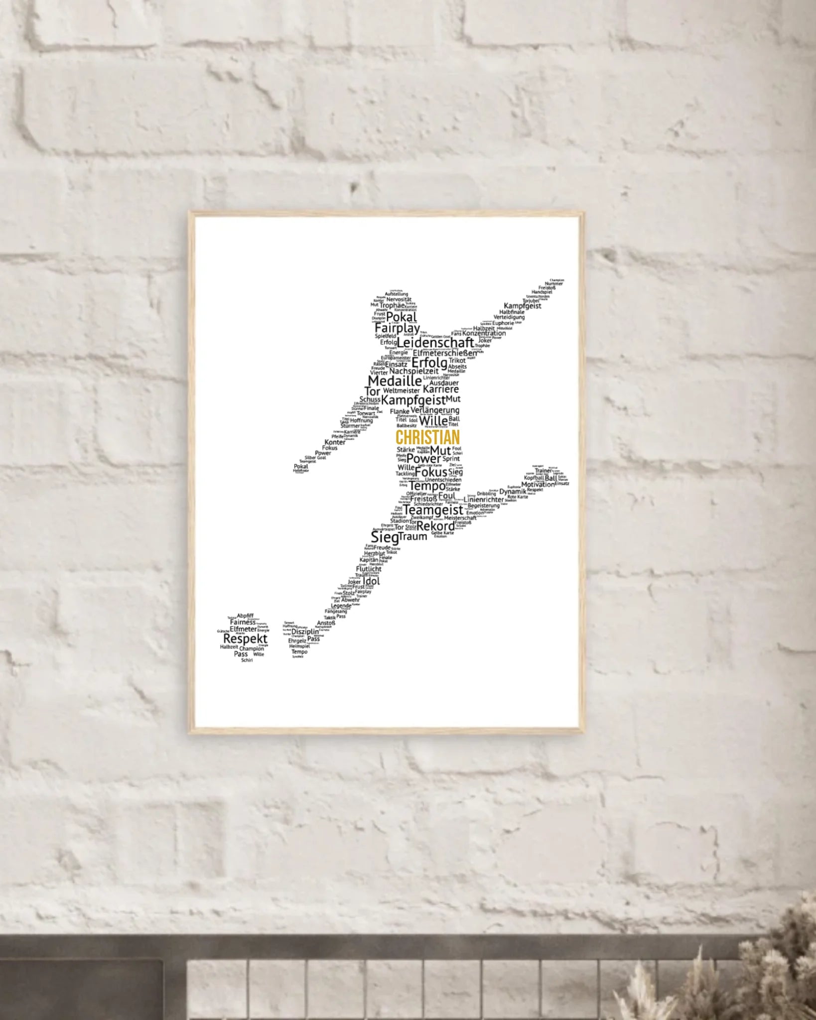 Ein Must-Have für alle Fußballfans! Dieses personalisierte Poster zeigt die dynamische Silhouette eines Fußballspielers, zusammengesetzt aus kraftvollen Begriffen rund um den Sport - von Teamgeist über Leidenschaft bis hin zu Erfolg. Das Highlight: Dein eigener Name steht mittendrin und macht dich zum Mittelpunkt der Action.