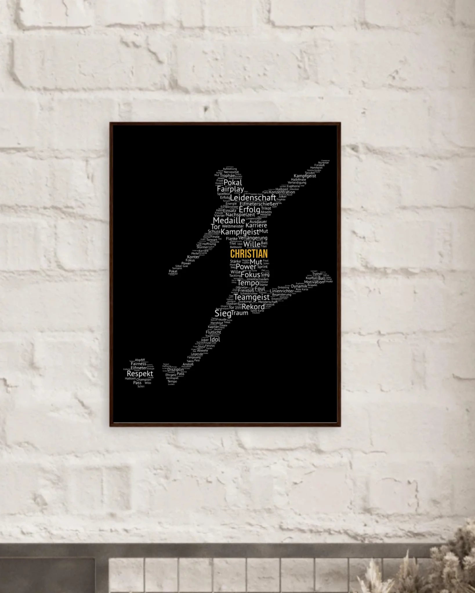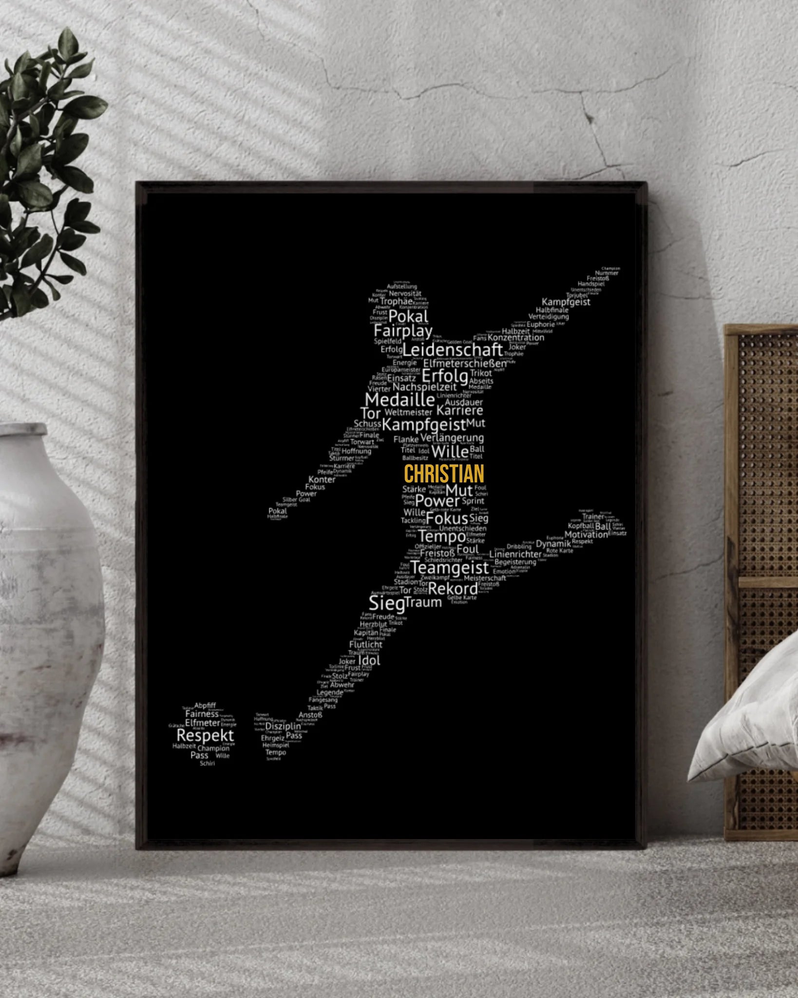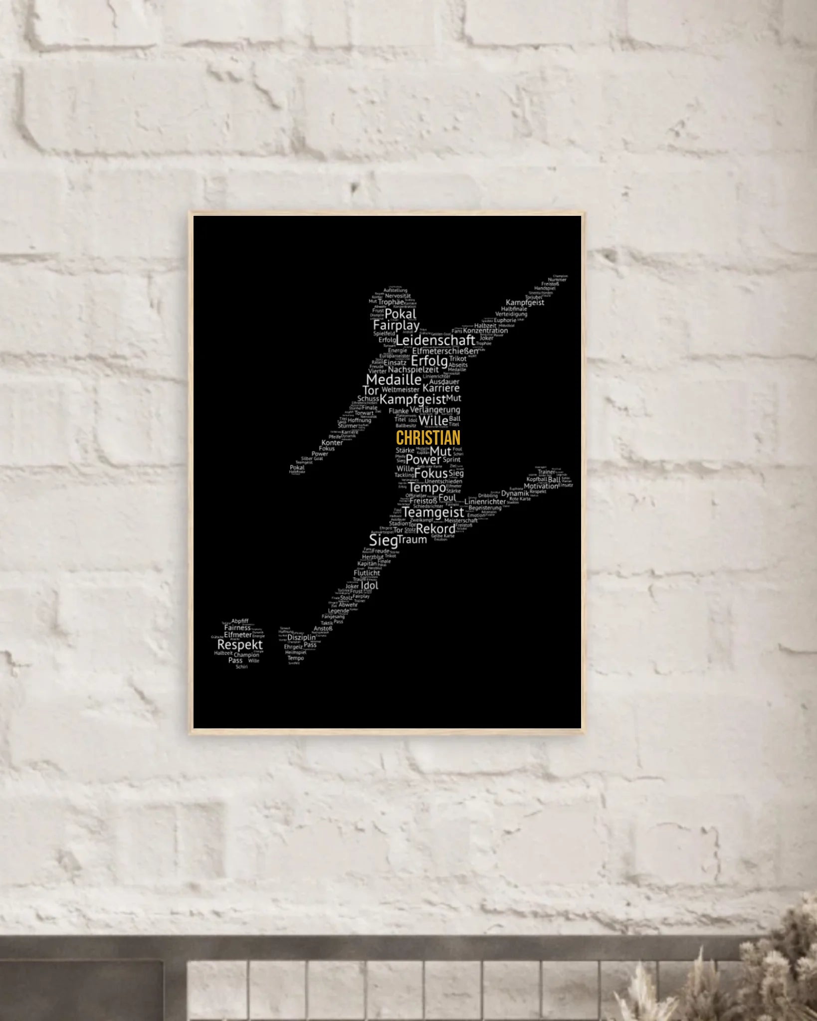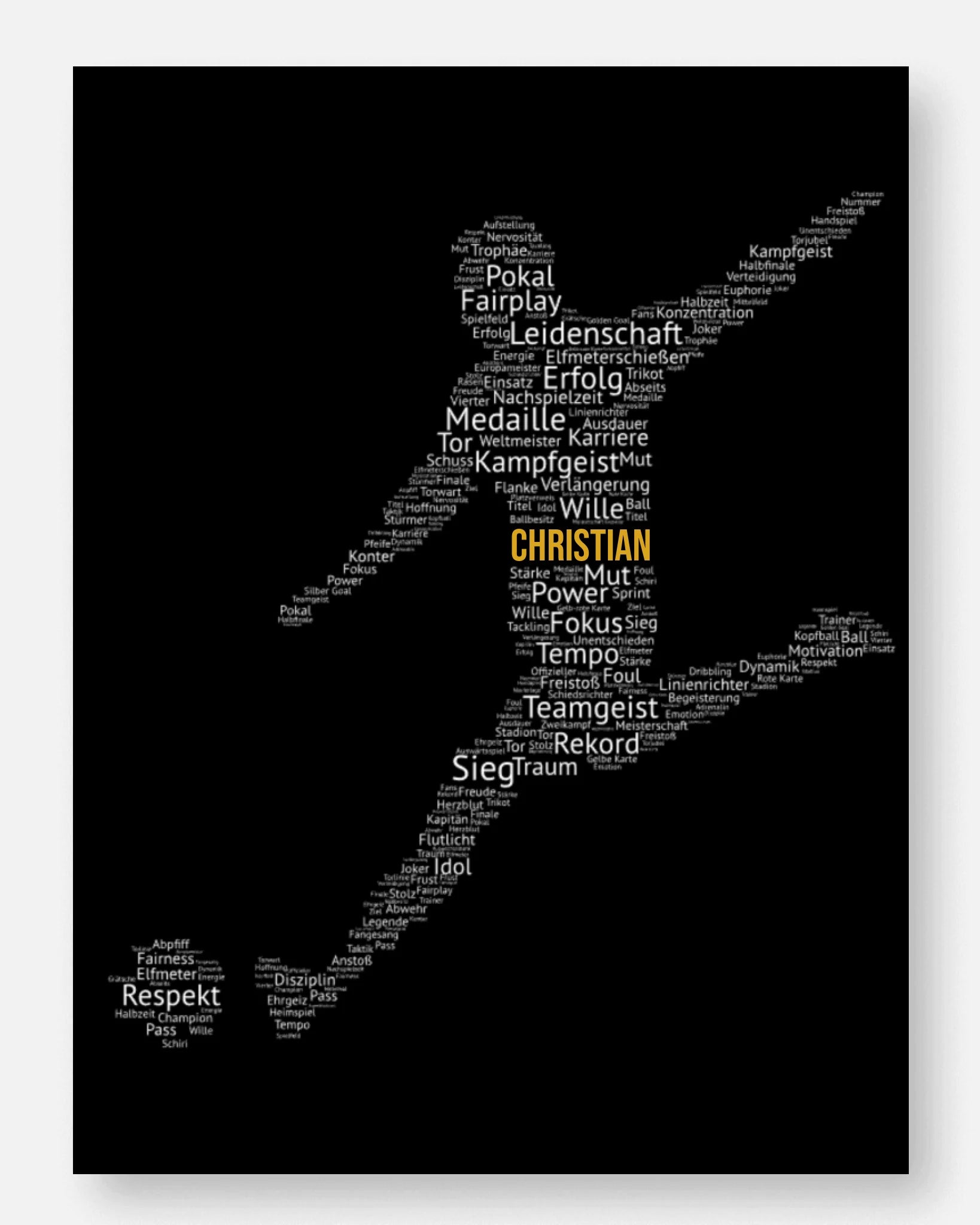 Ein Must-Have für alle Fußballfans! Dieses personalisierte Poster zeigt die dynamische Silhouette eines Fußballspielers, zusammengesetzt aus kraftvollen Begriffen rund um den Sport - von Teamgeist über Leidenschaft bis hin zu Erfolg. Das Highlight: Dein eigener Name steht mittendrin und macht dich zum Mittelpunkt der Action.