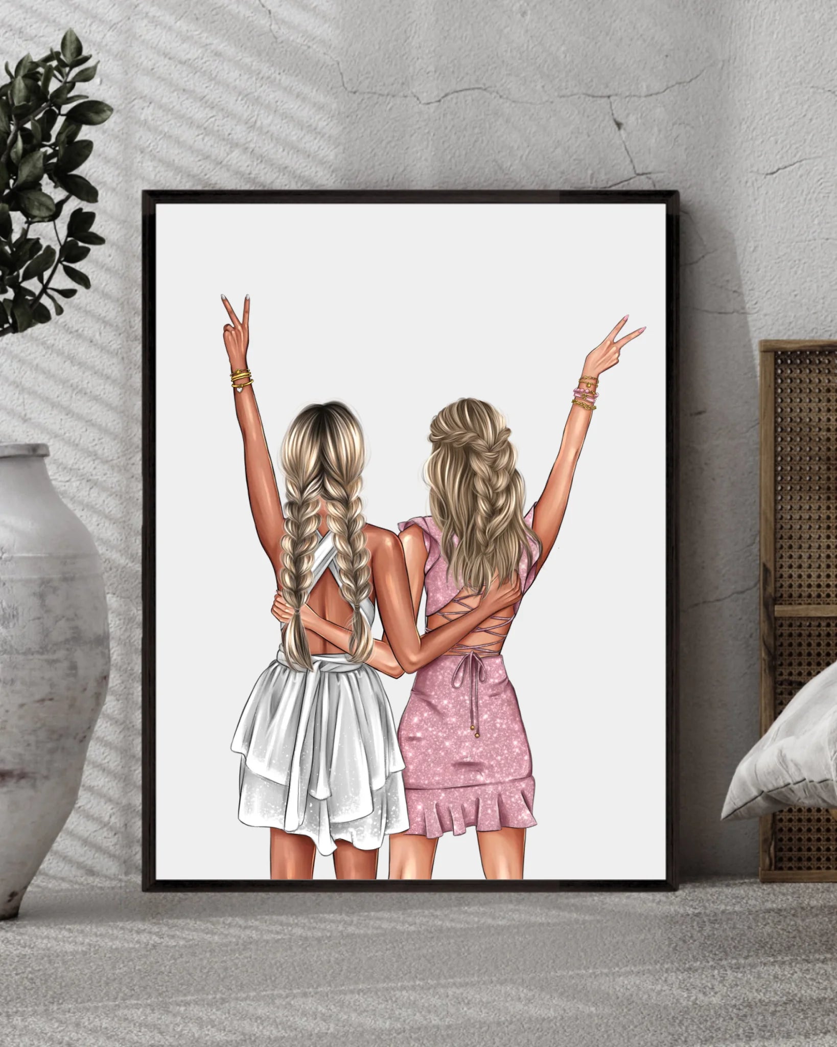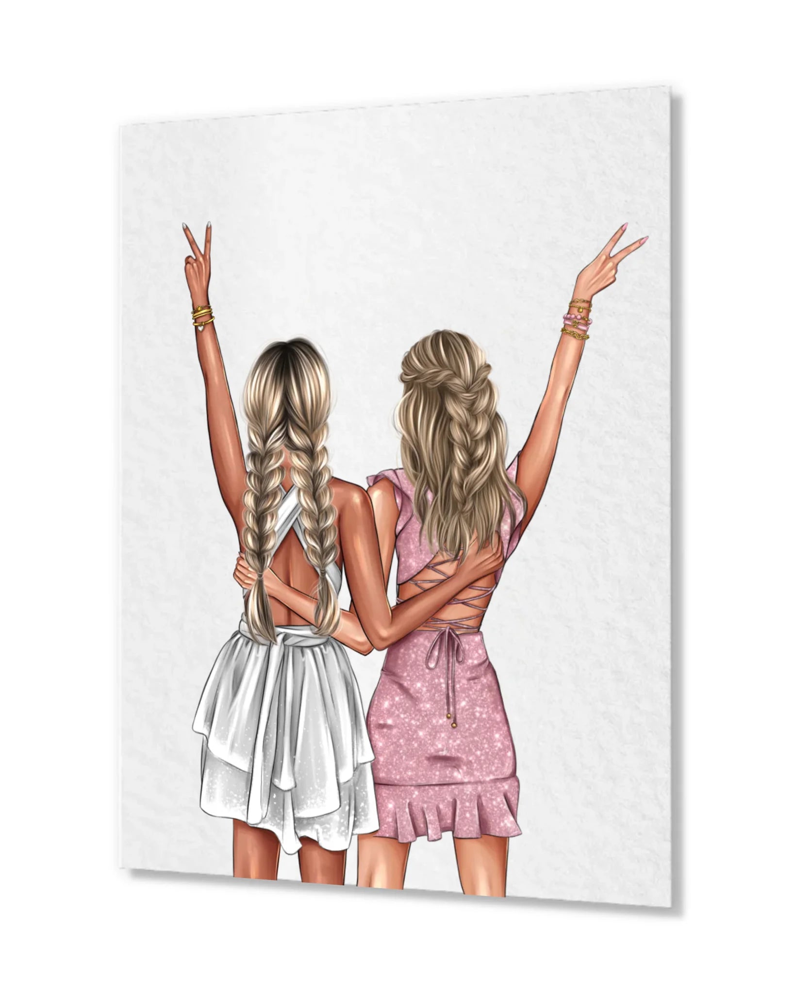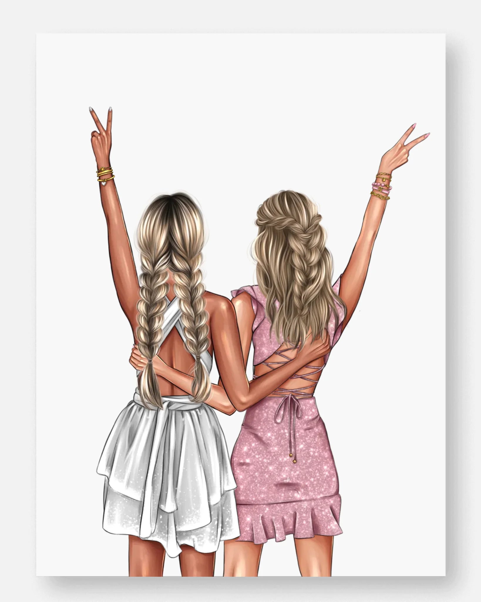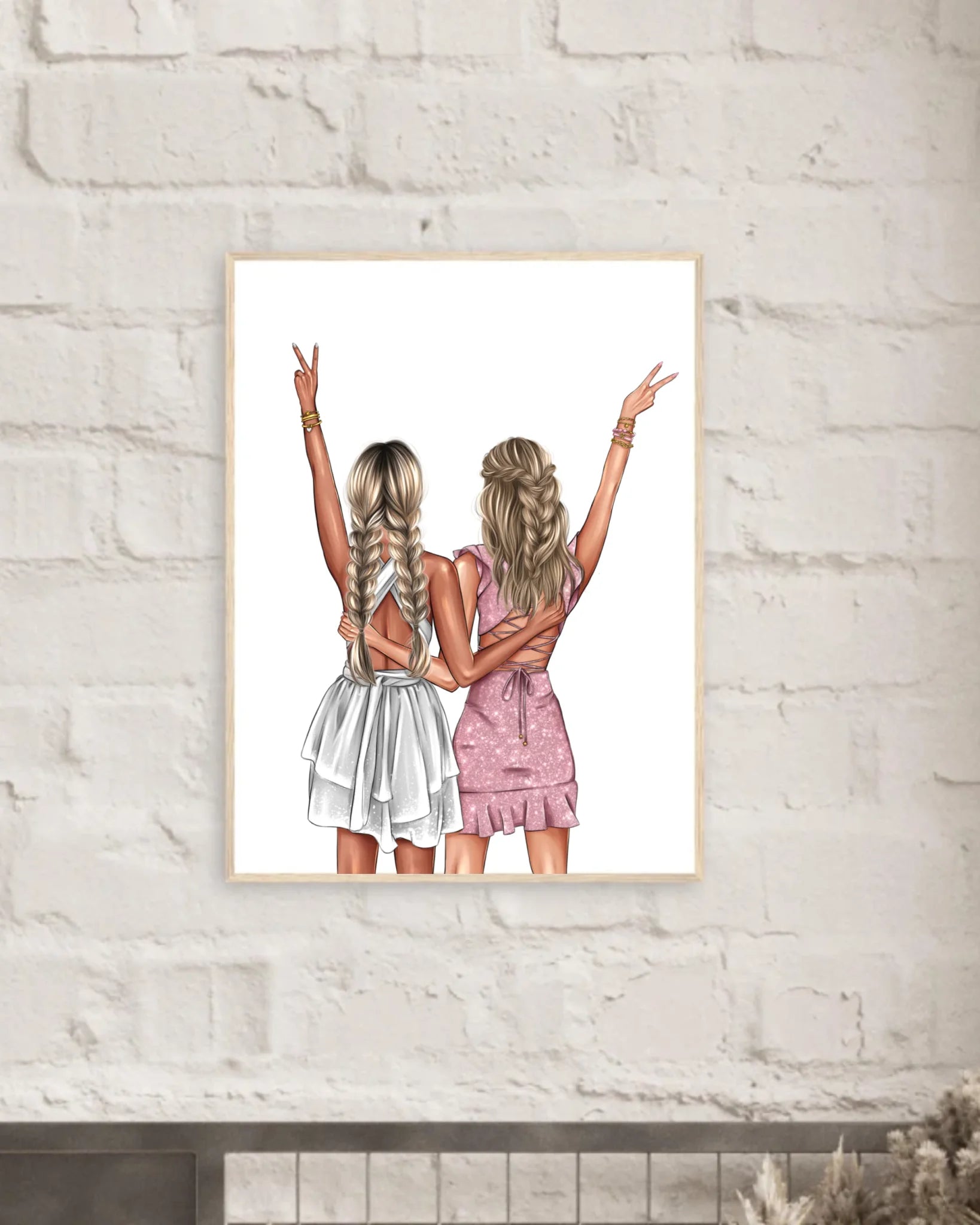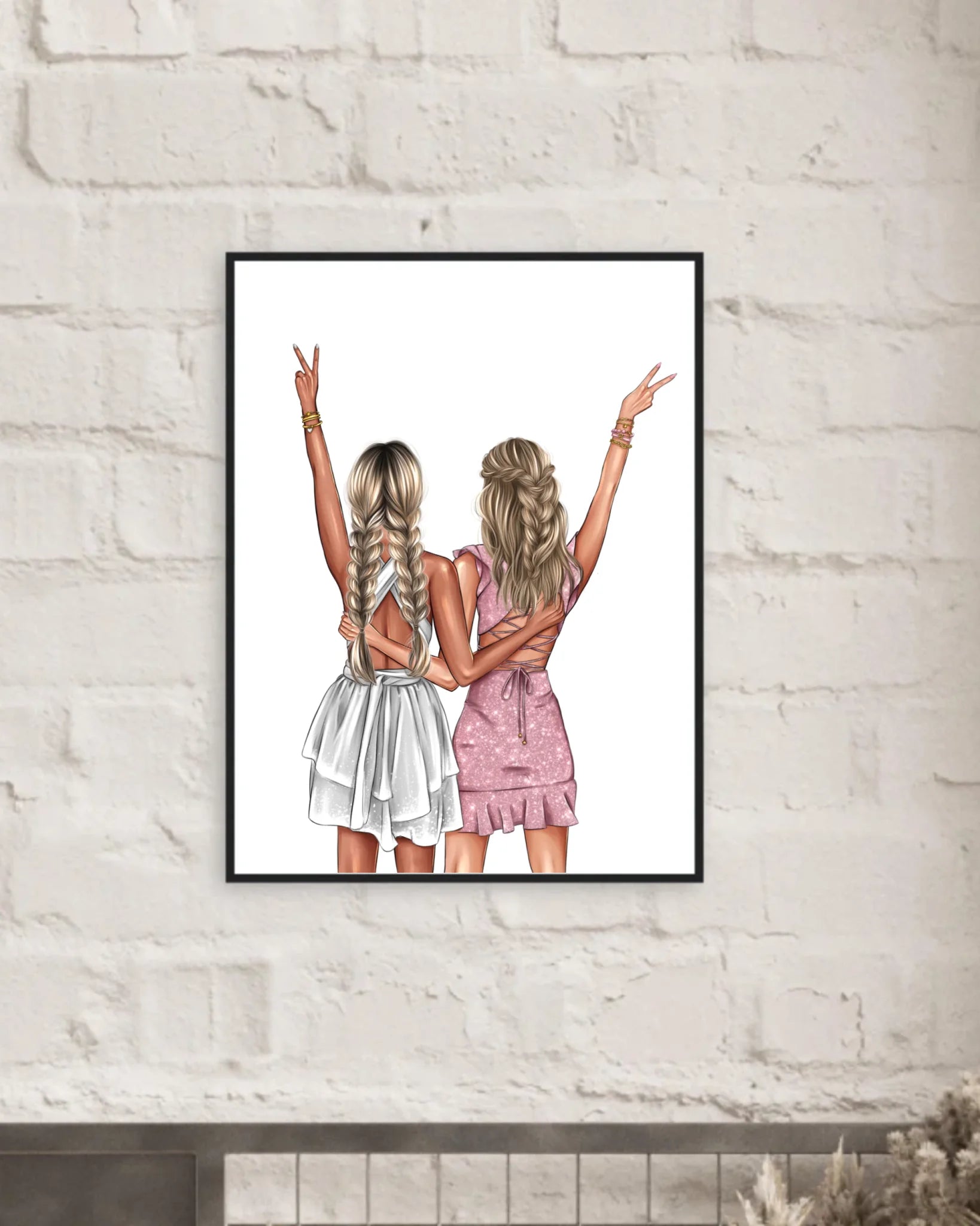 Du kannst das Poster individuell gestalten, indem du Haarfarben, Frisuren und Outfits auswählst, sodass ihr euch darin perfekt wiedererkennt. Zusätzlich kannst du einen persönlichen Wunschtext hinzufügen, der eure besondere Freundschaft widerspiegelt.