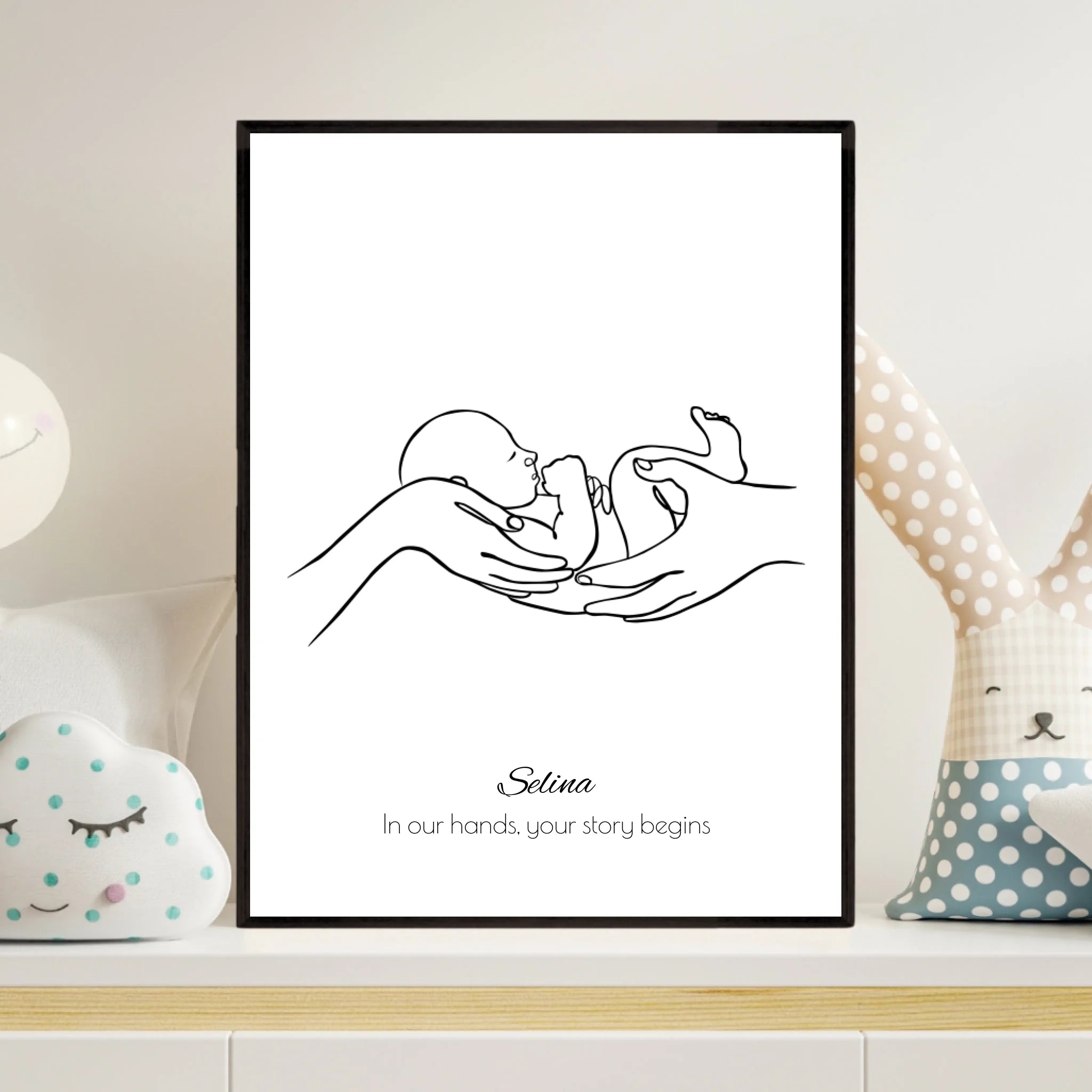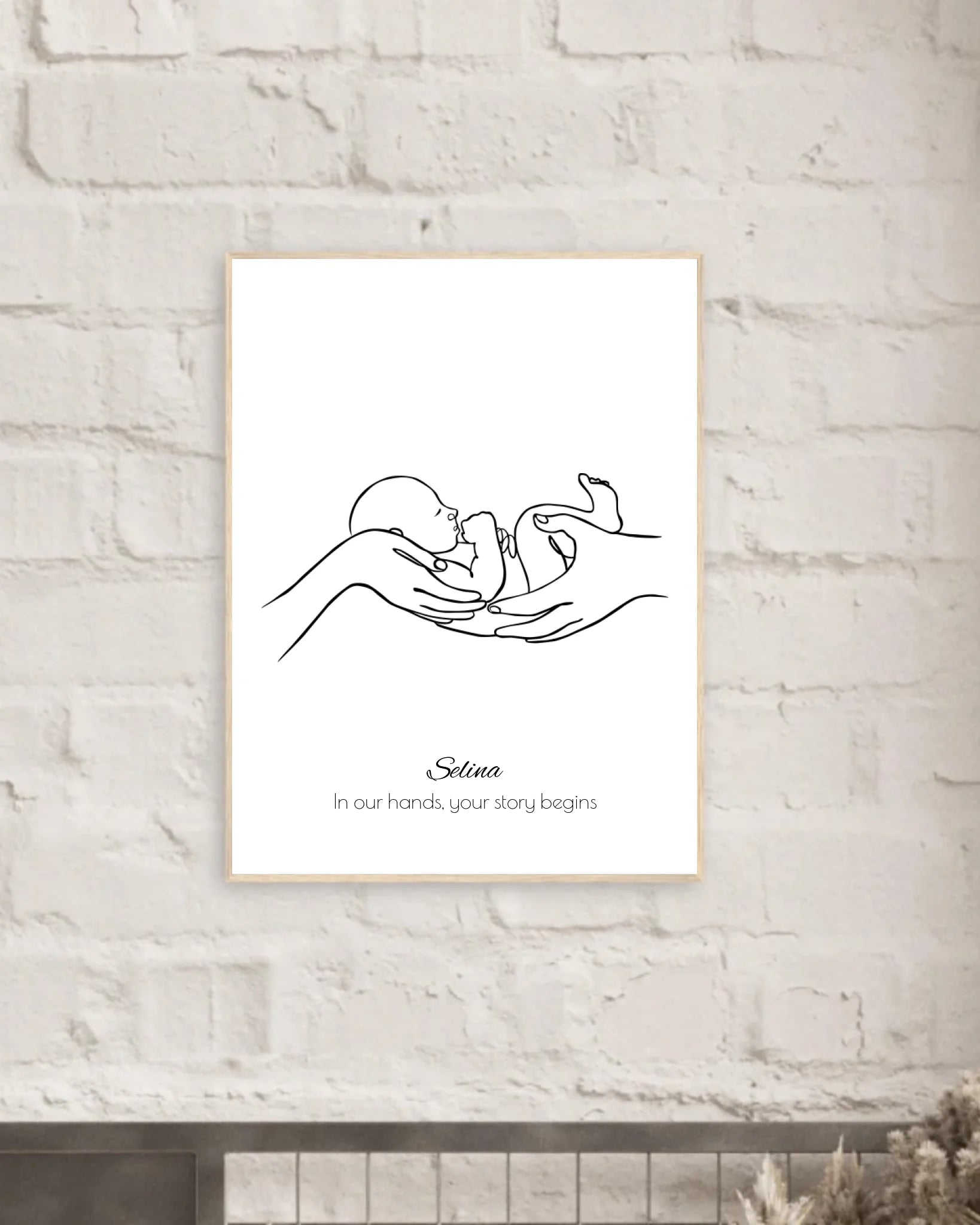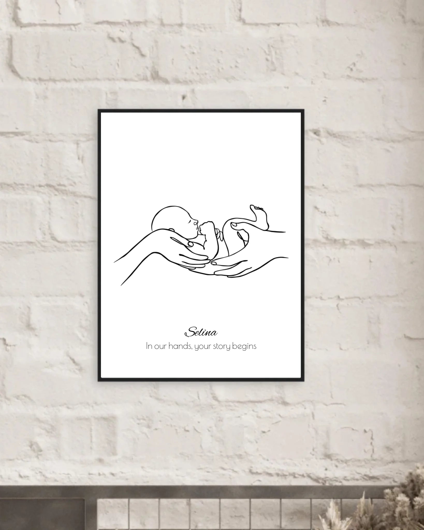 Dieses minimalistische Fineline-Poster zeigt ein Baby, das liebevoll von schützenden Händen gehalten wird - ein Symbol für Vertrauen, Fürsorge und den Beginn eines neuen Lebens. Ob zur Geburt, Taufe oder als Erinnerung fürs Kinderzimmer: Dieses Poster ist ein zarter Ausdruck elterlicher Liebe.