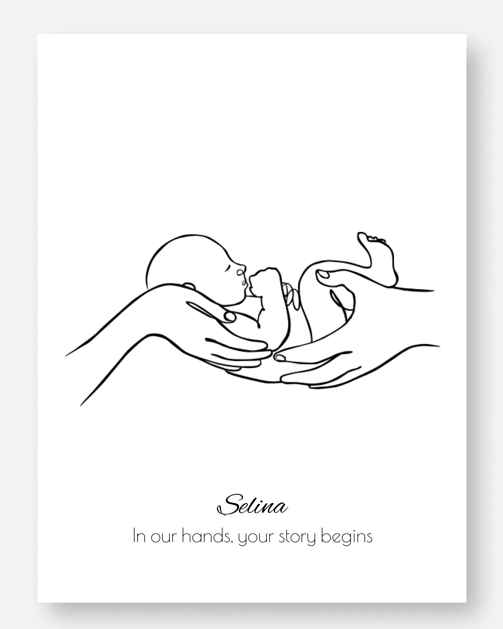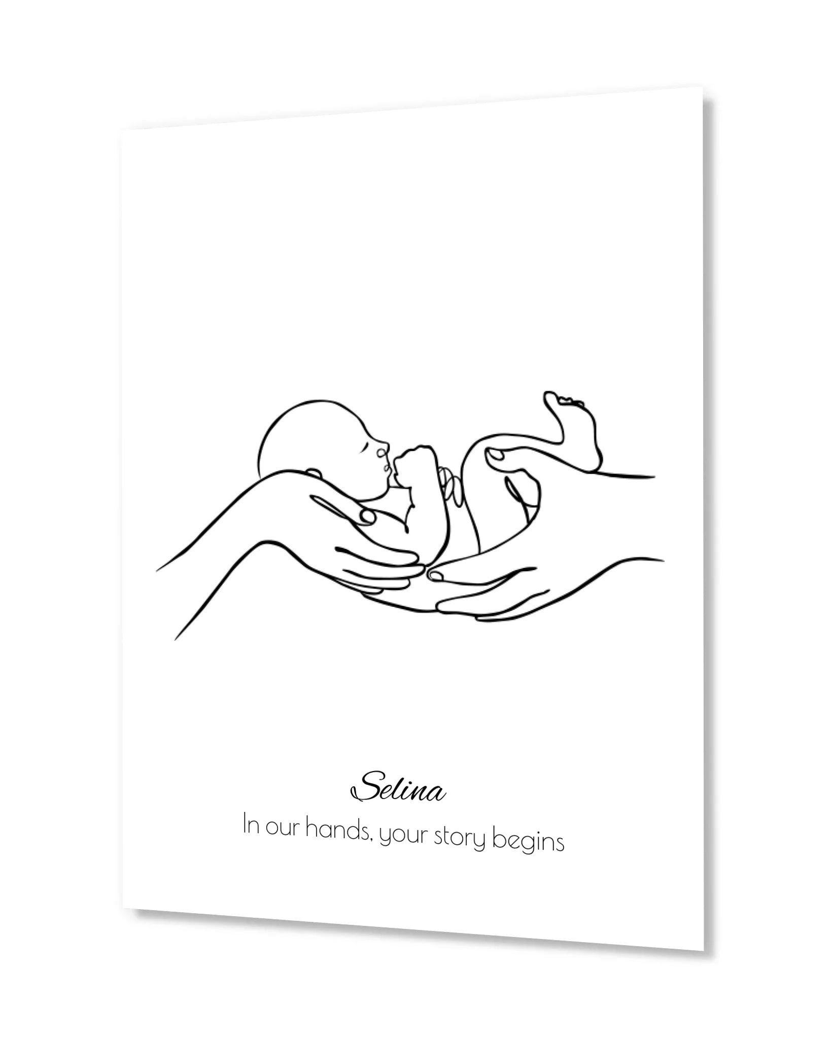 Die Fineline-Zeichnung zeigt ein Baby, das behutsam von schützenden Händen getragen wird. Das Motiv steht symbolisch für Vertrauen, Fürsorge und den sicheren Beginn eines neuen Lebens.