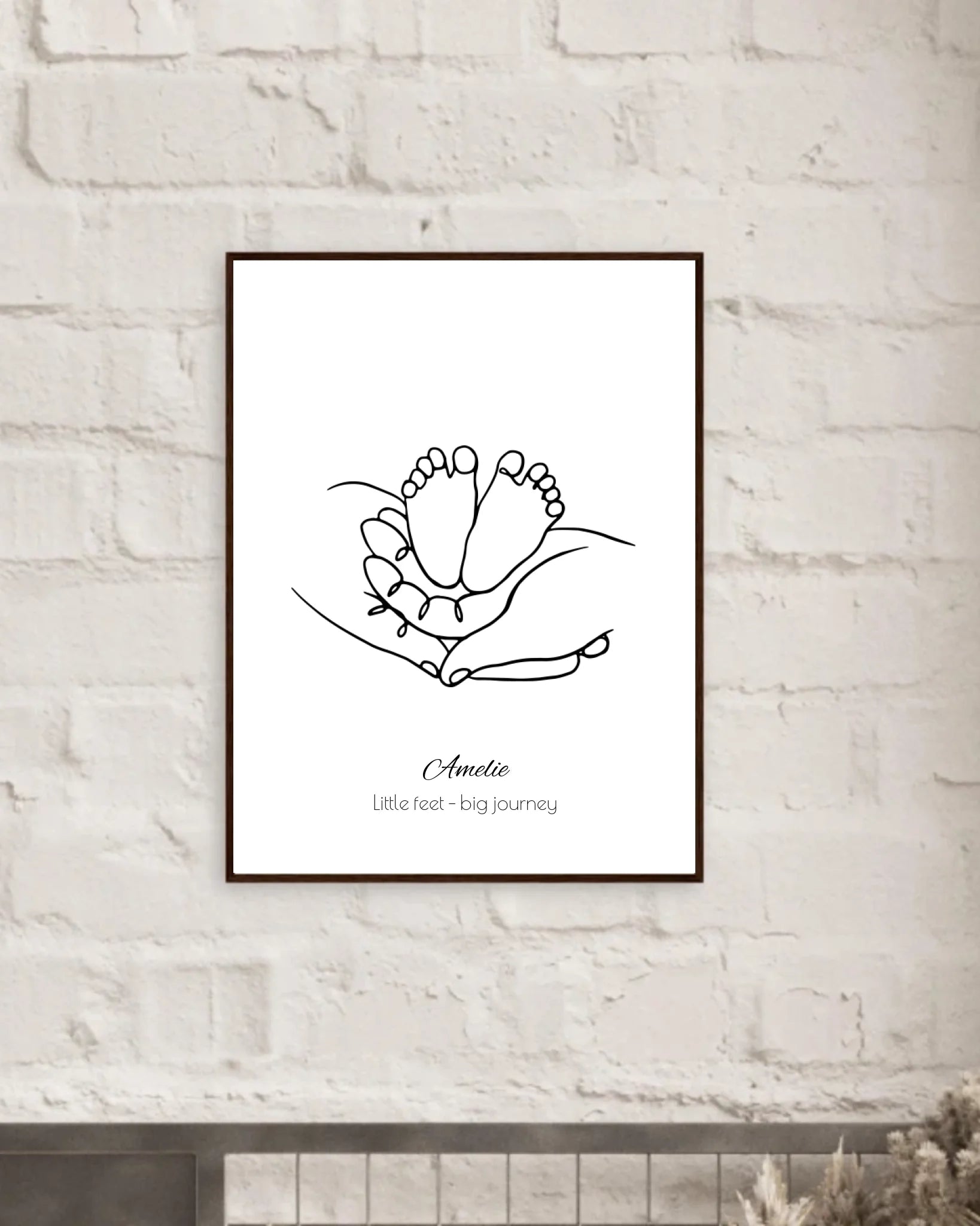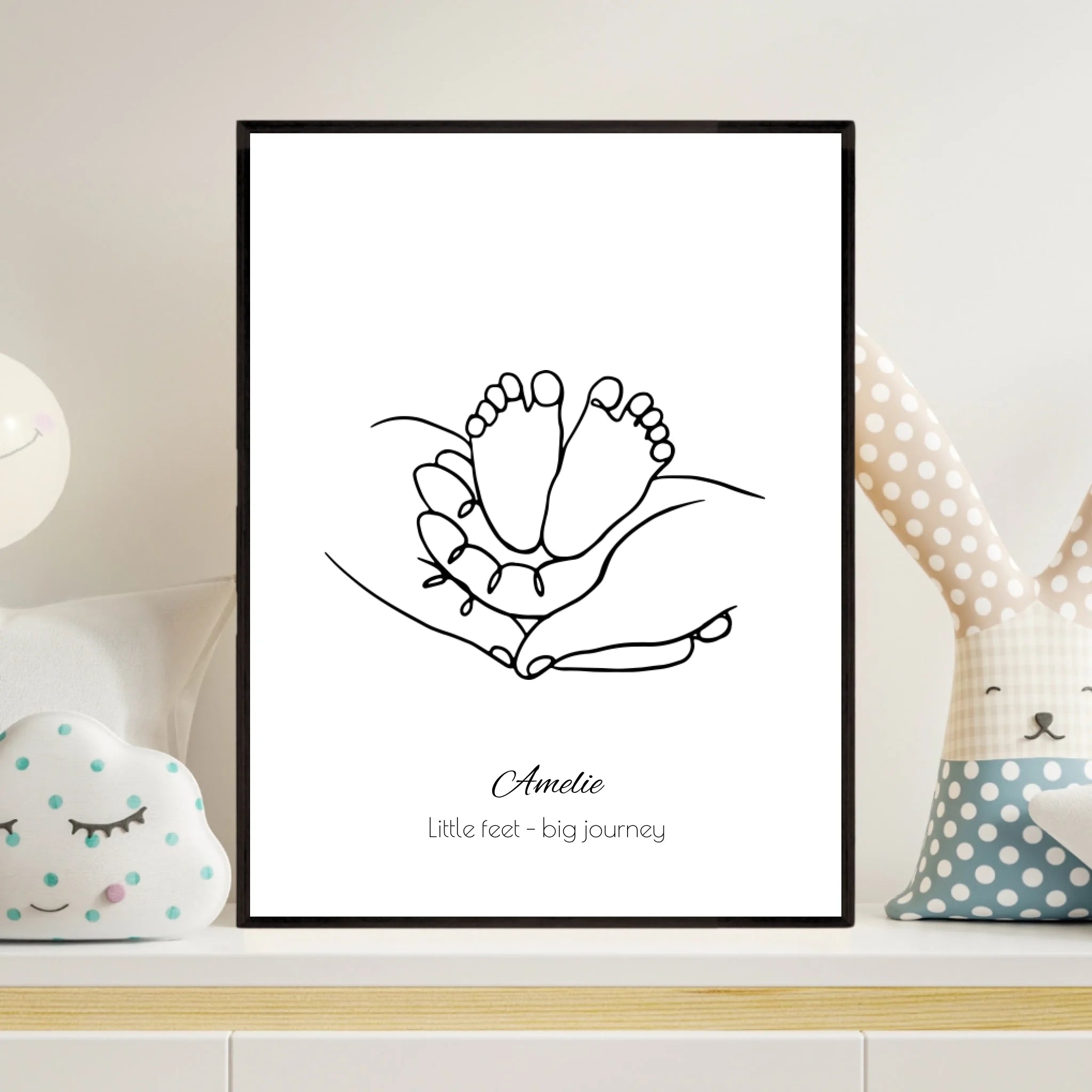 Dieses emotionale Fineline-Poster zeigt zarte Babyfüße, geborgen in schützenden Händen - ein starkes Symbol für Sicherheit, Vertrauen und elterliche Liebe. Der minimalistische Stil verleiht dem Motiv zeitlose Eleganz, während Name und Spruch es zu deinem ganz persönlichen Kunstwerk machen.