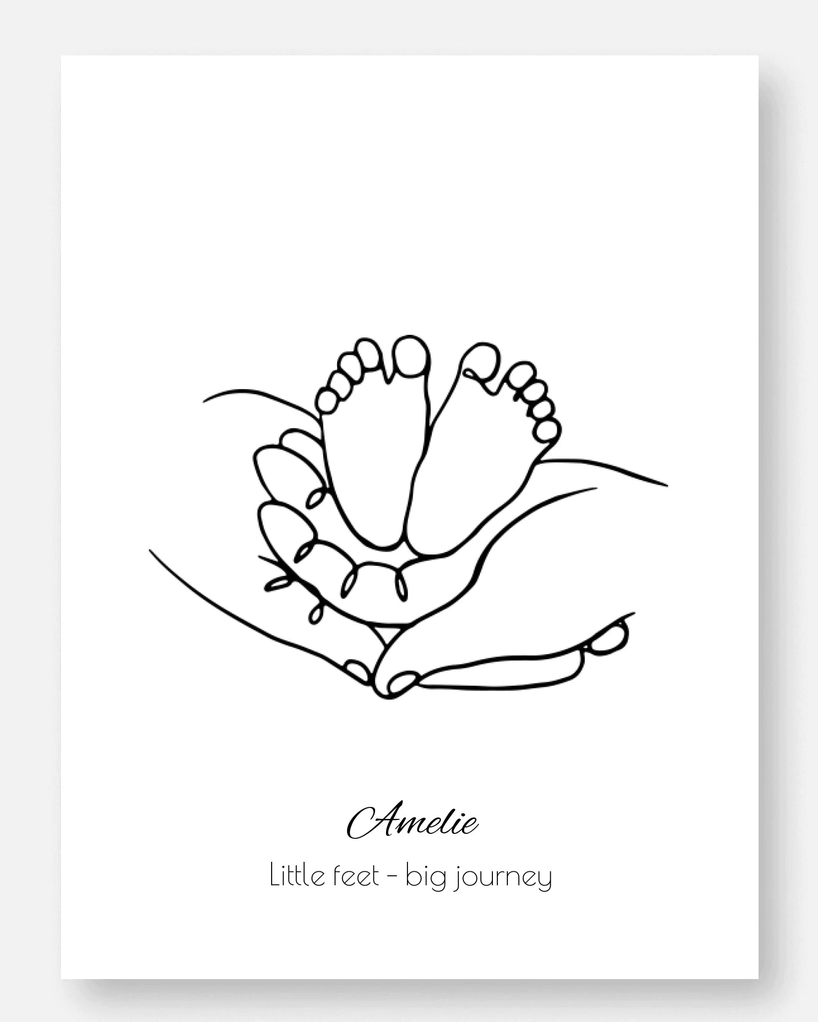 Die feine Linienzeichnung zeigt zarte Babyfüße, geborgen in schützenden Händen - ein starkes Symbol für Halt, Geborgenheit und Verbundenheit. Der minimalistische Stil verleiht dem Motiv zeitlose Eleganz und emotionale Tiefe.