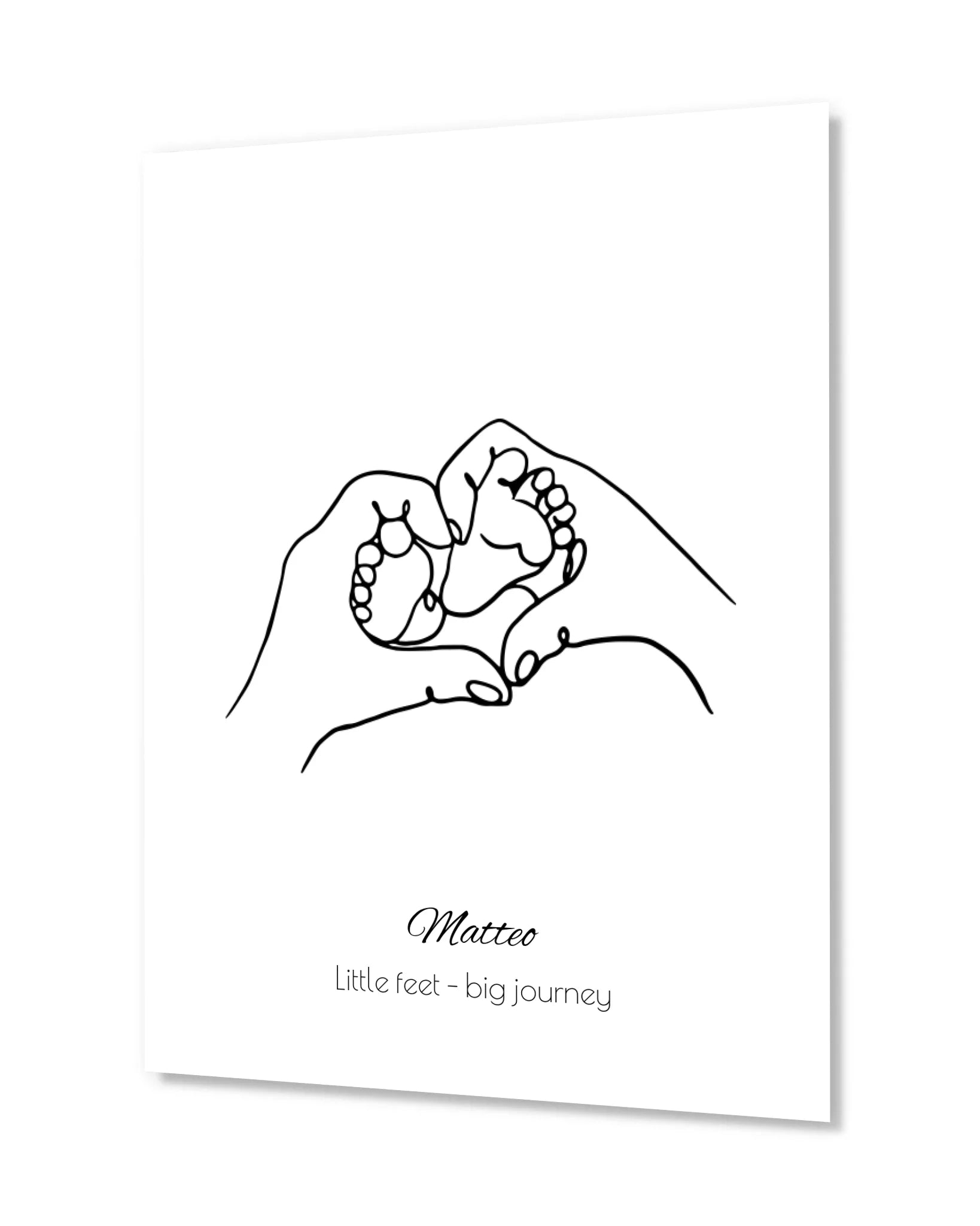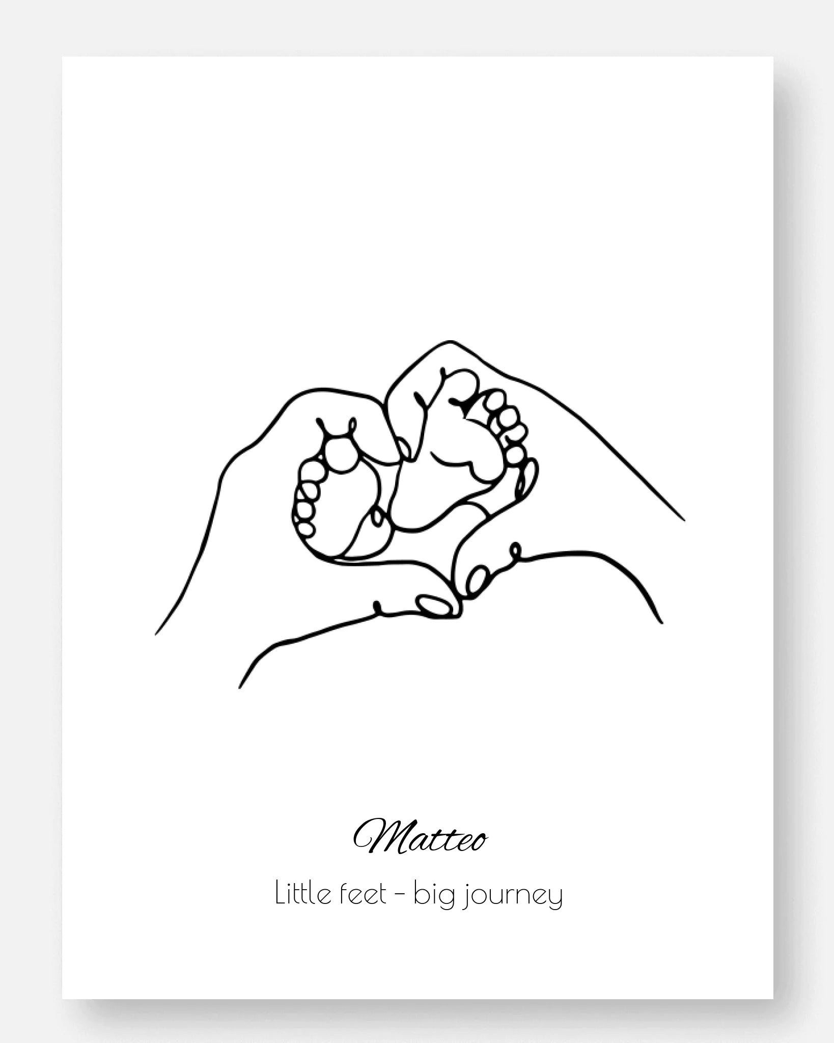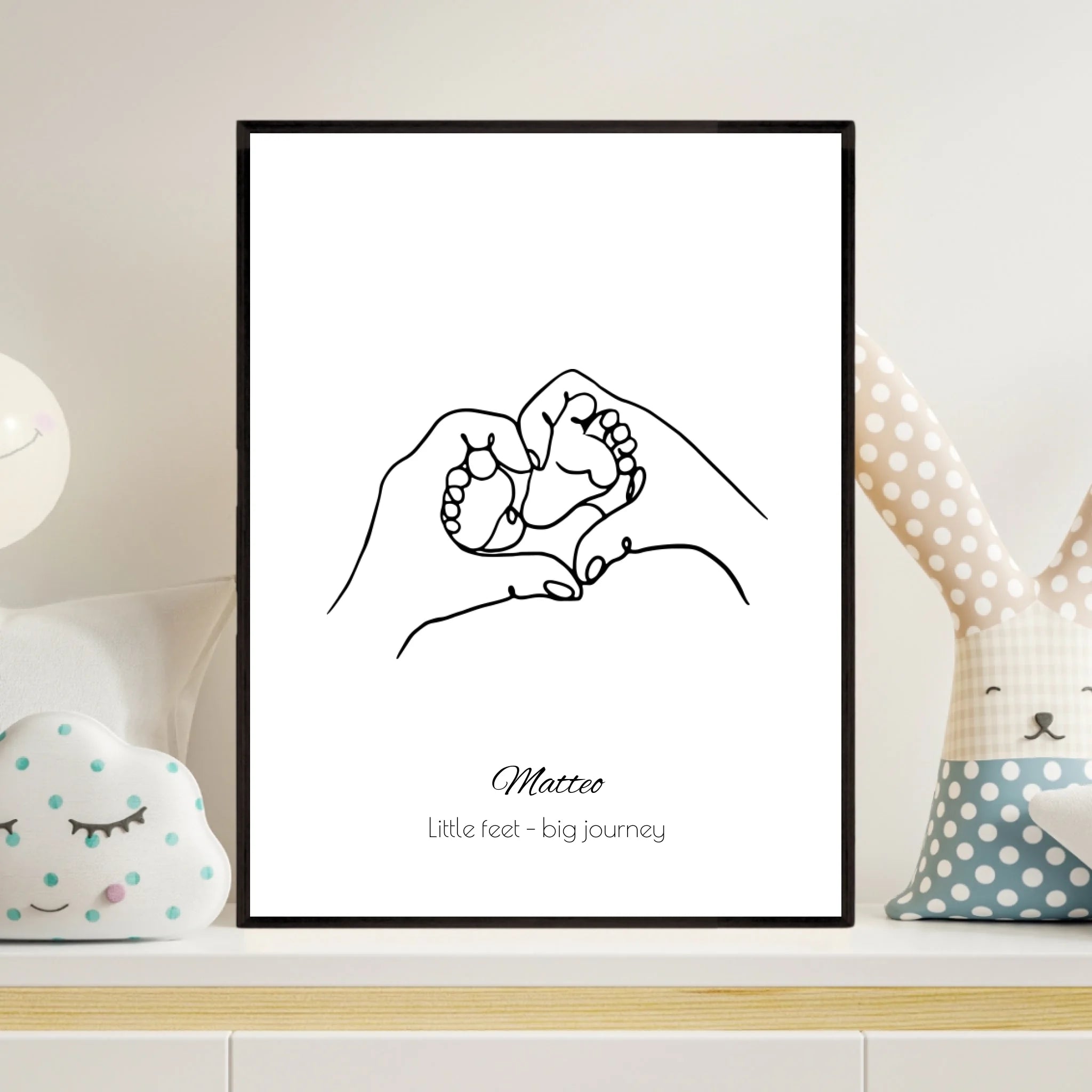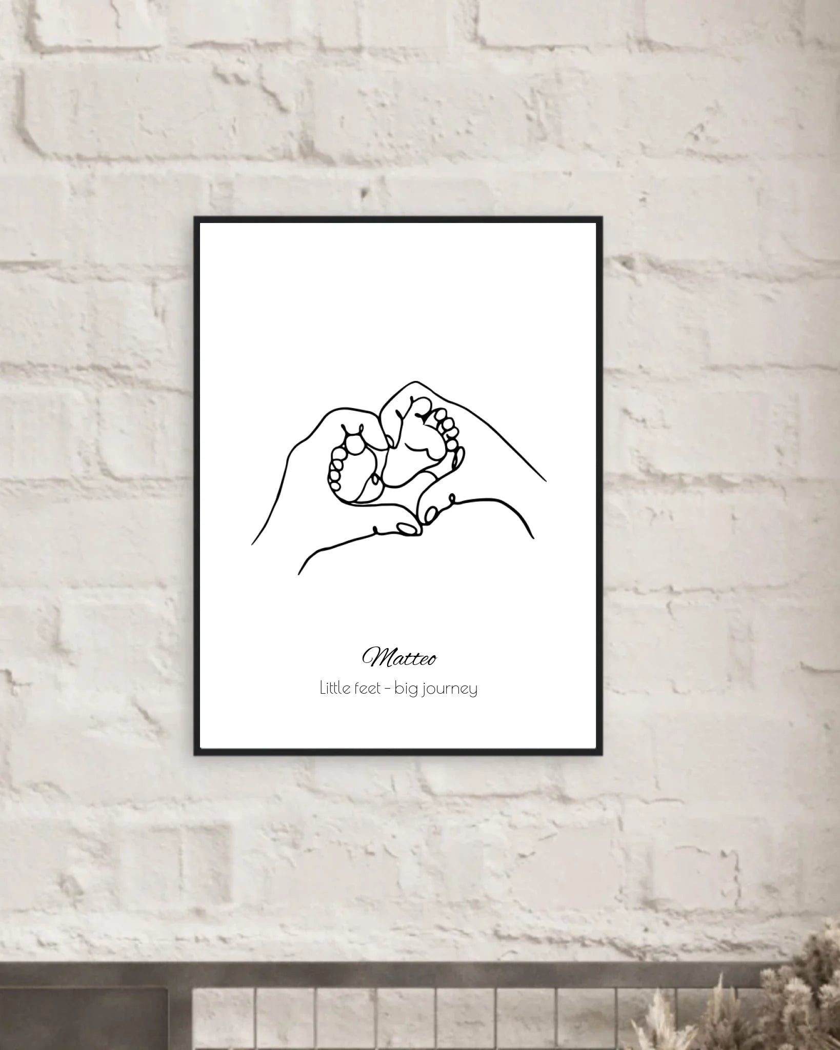 Dieses zarte Fineline-Poster zeigt zwei liebevoll geformte Hände, die winzige Babyfüße in Herzform umschließen - ein berührendes Symbol für bedingungslose Liebe und Fürsorge. Personalisiert mit deinem Wunschnamen und Spruch, wird daraus ein zeitloses Erinnerungsstück an die ersten Schritte ins Leben.