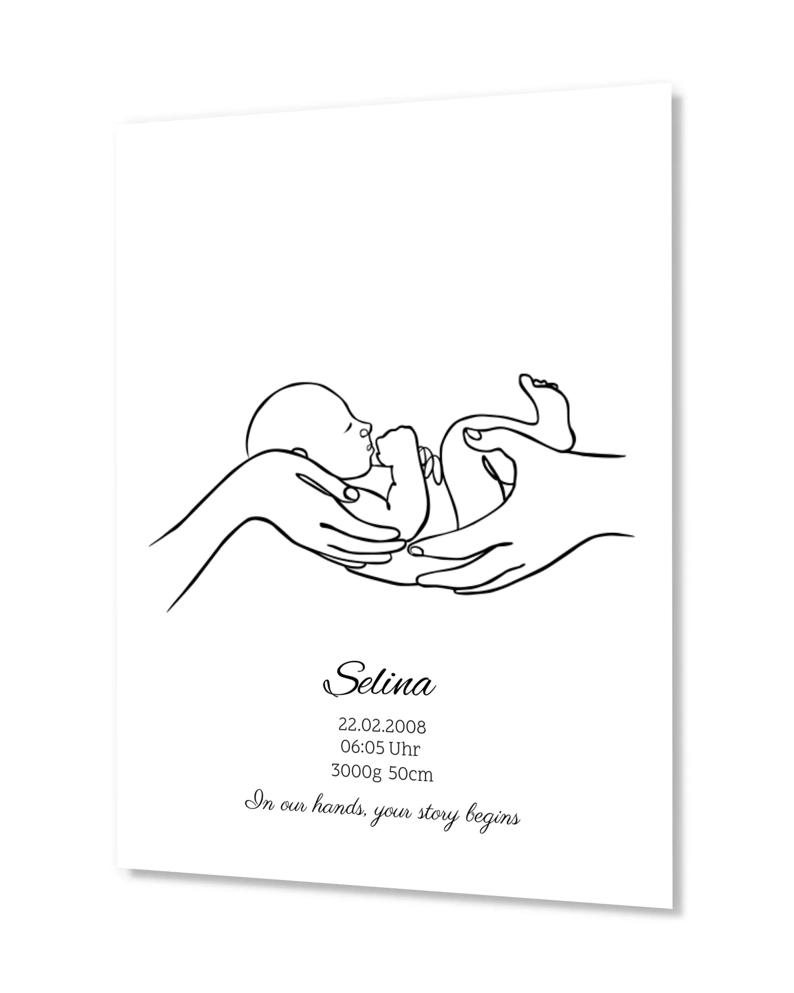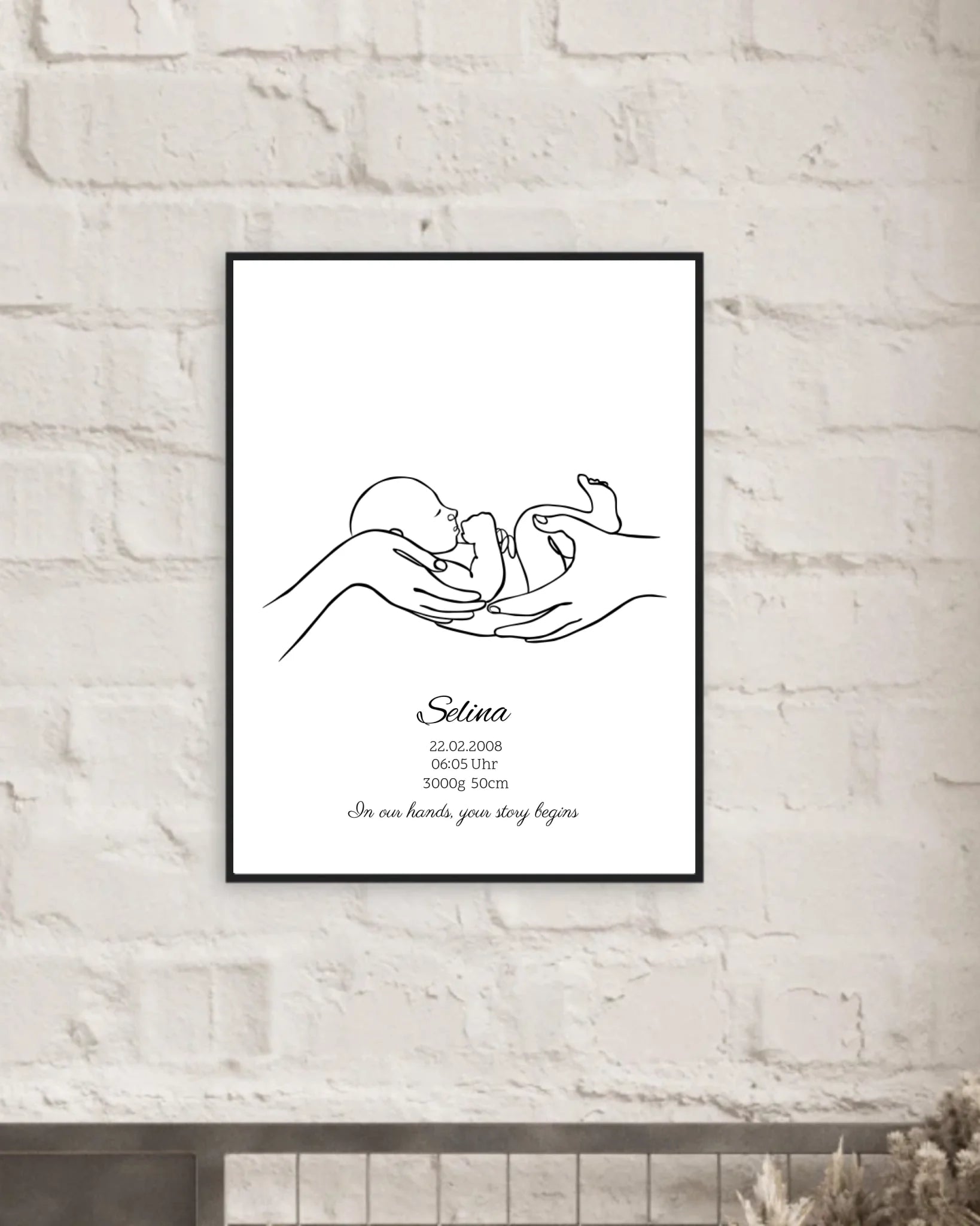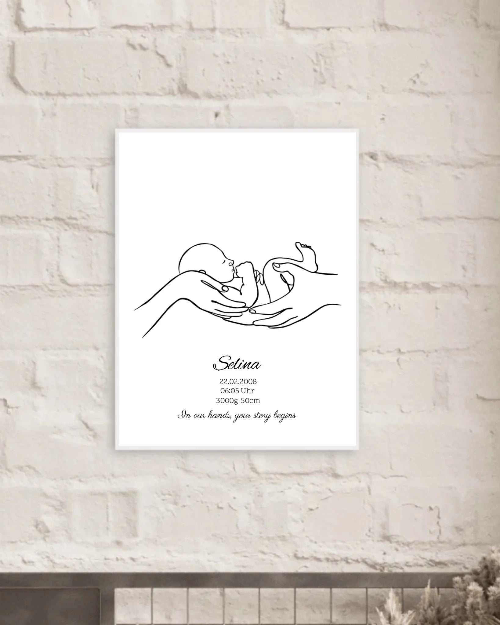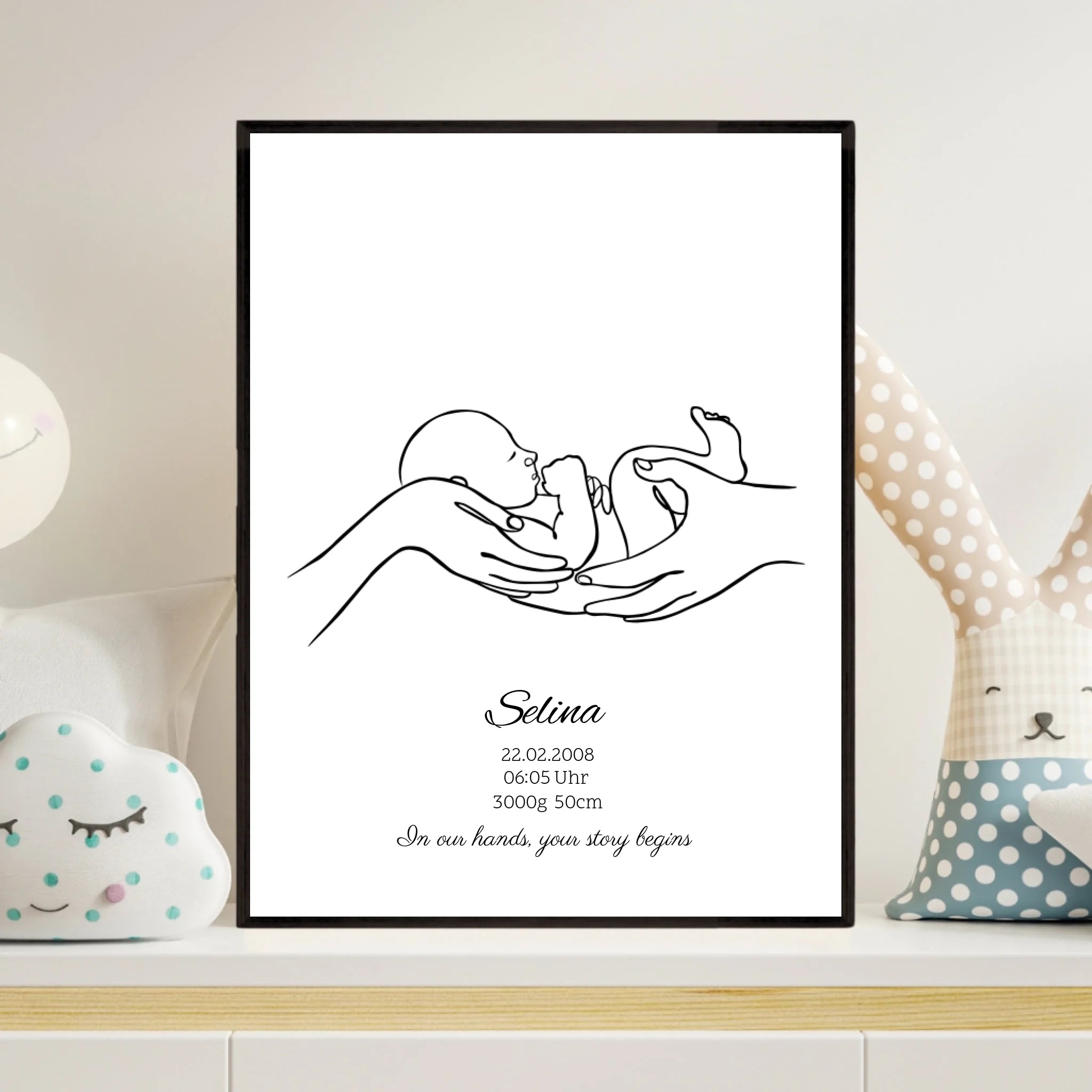 In unseren Händen beginnt deine Geschichte - personalisiertes Geburts-Poster
