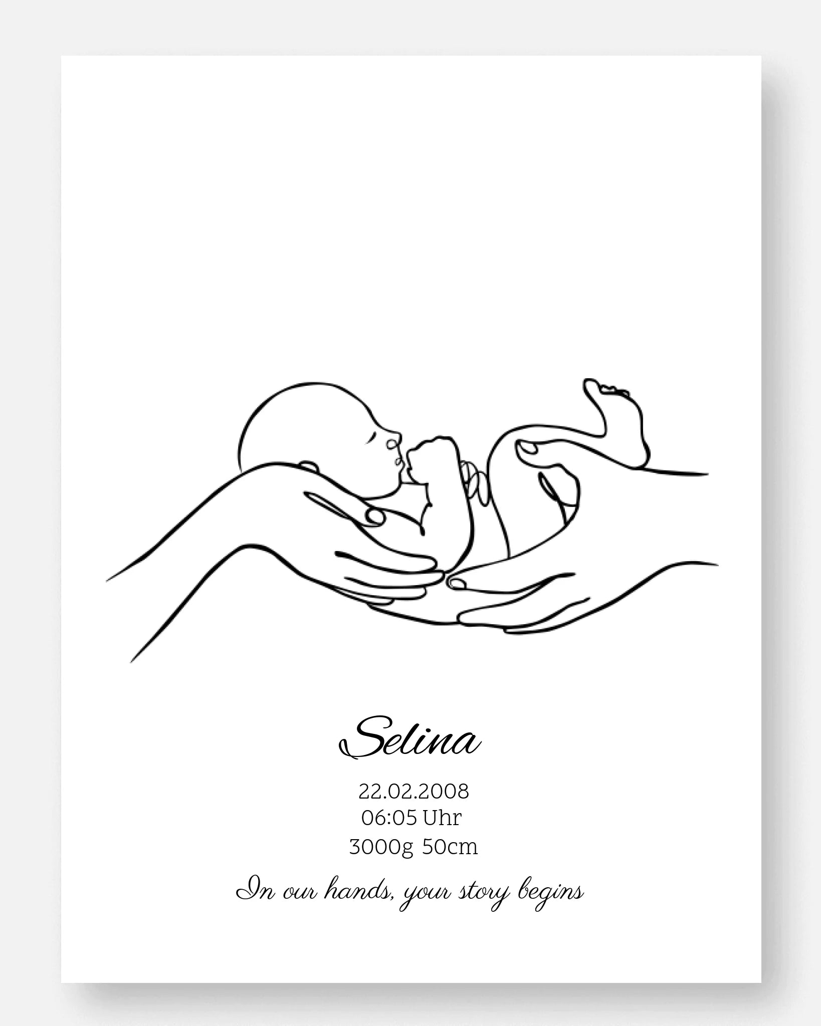 Dieses filigrane Fineline-Poster zeigt ein berührendes Motiv: behutsame Hände, die ein Neugeborenes liebevoll tragen. Ein Symbol für Geborgenheit, Vertrauen und den Anfang einer einzigartigen Lebensreise. Mit persönlichen Daten wie Name, Geburtsdatum, Uhrzeit, Gewicht und Größe wird dieses Poster zu einem unverwechselbaren Erinnerungsstück an den schönsten Anfang im Leben.