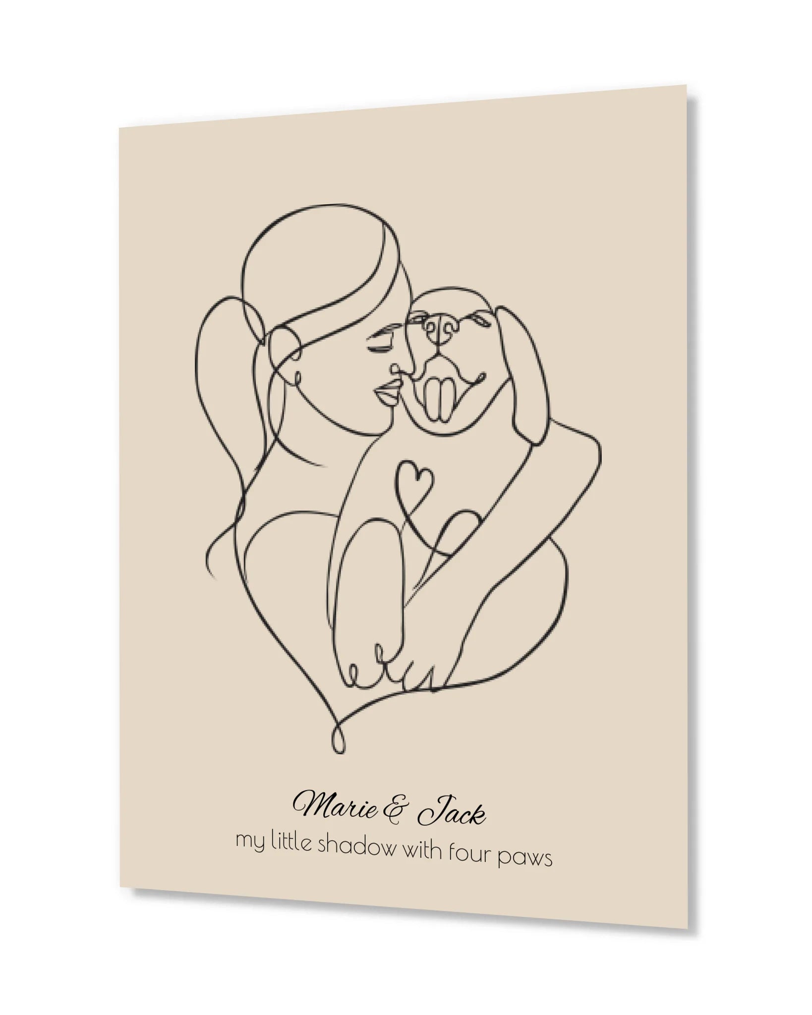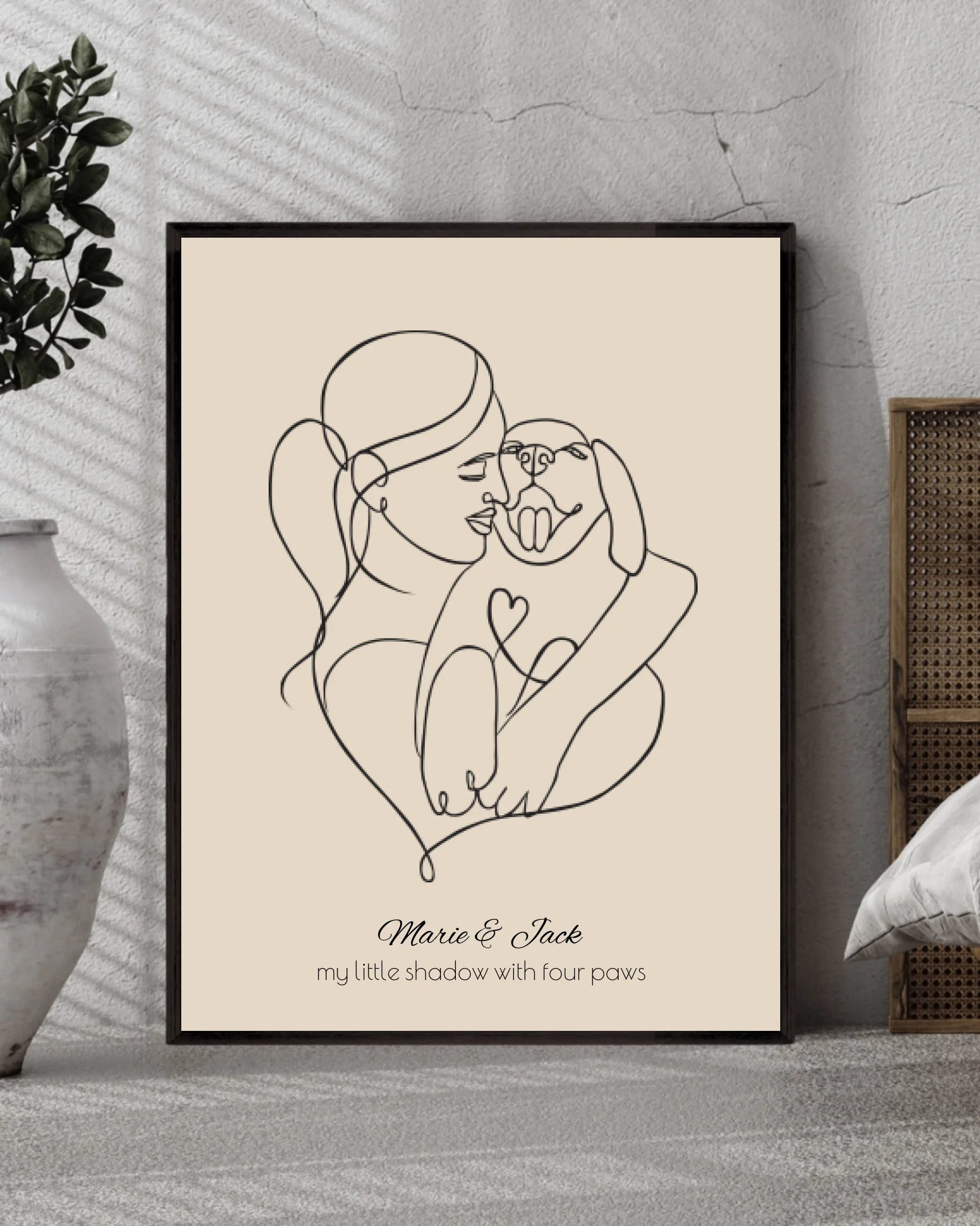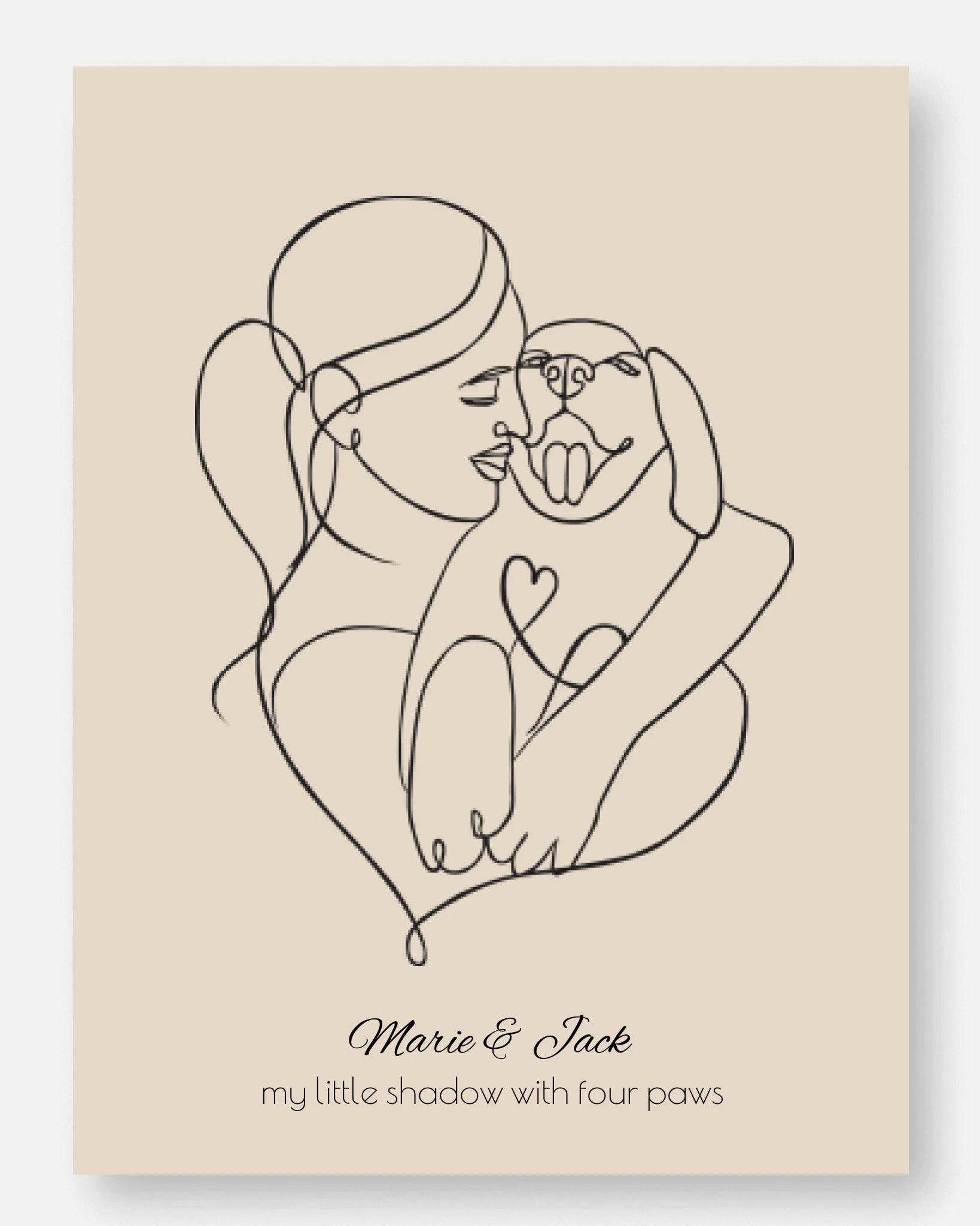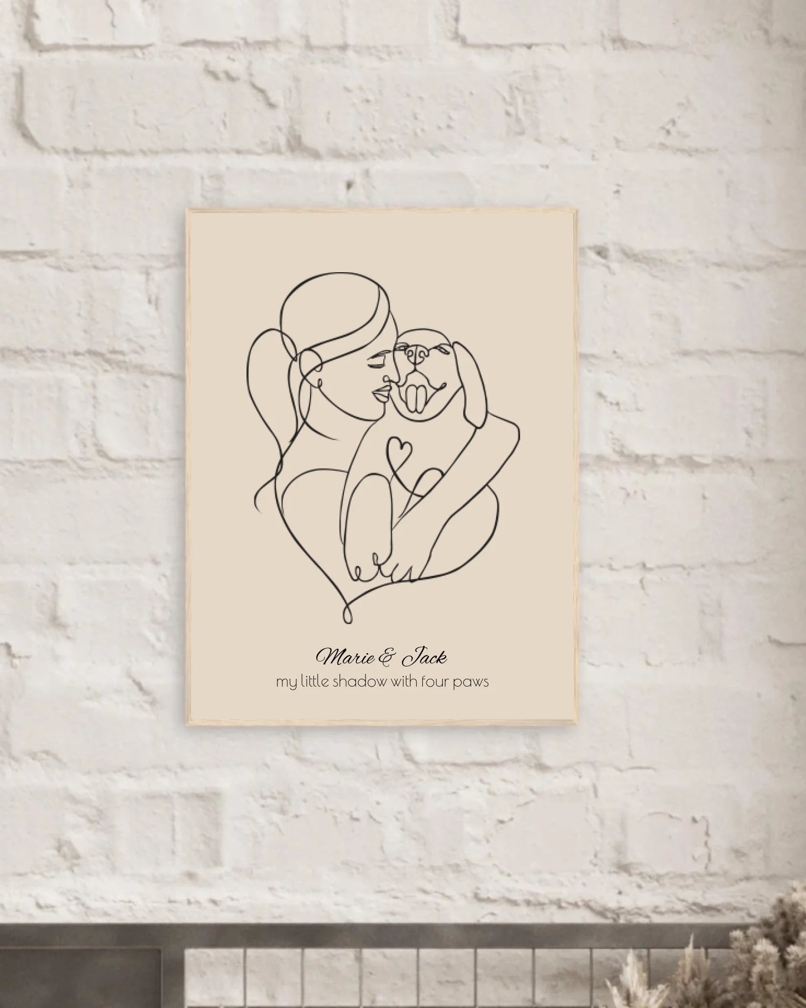 Dieses minimalistische Fineline-Poster zeigt auf kunstvolle Weise die besondere Bindung zwischen einem Mädchen und ihrem Hund - zart, emotional und zeitlos schön. Die klare Linienführung, ein personalisierbarer Hintergrund und Wunschtext machen es zu einem besonderen Andenken an die treue Begleitung auf vier Pfoten.