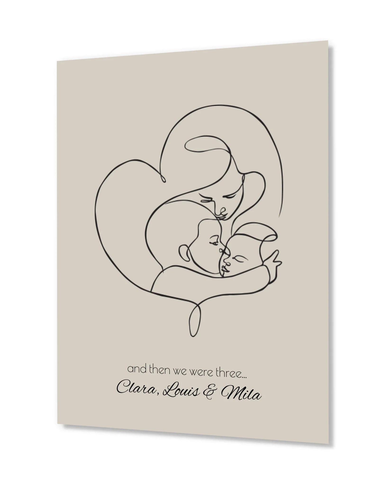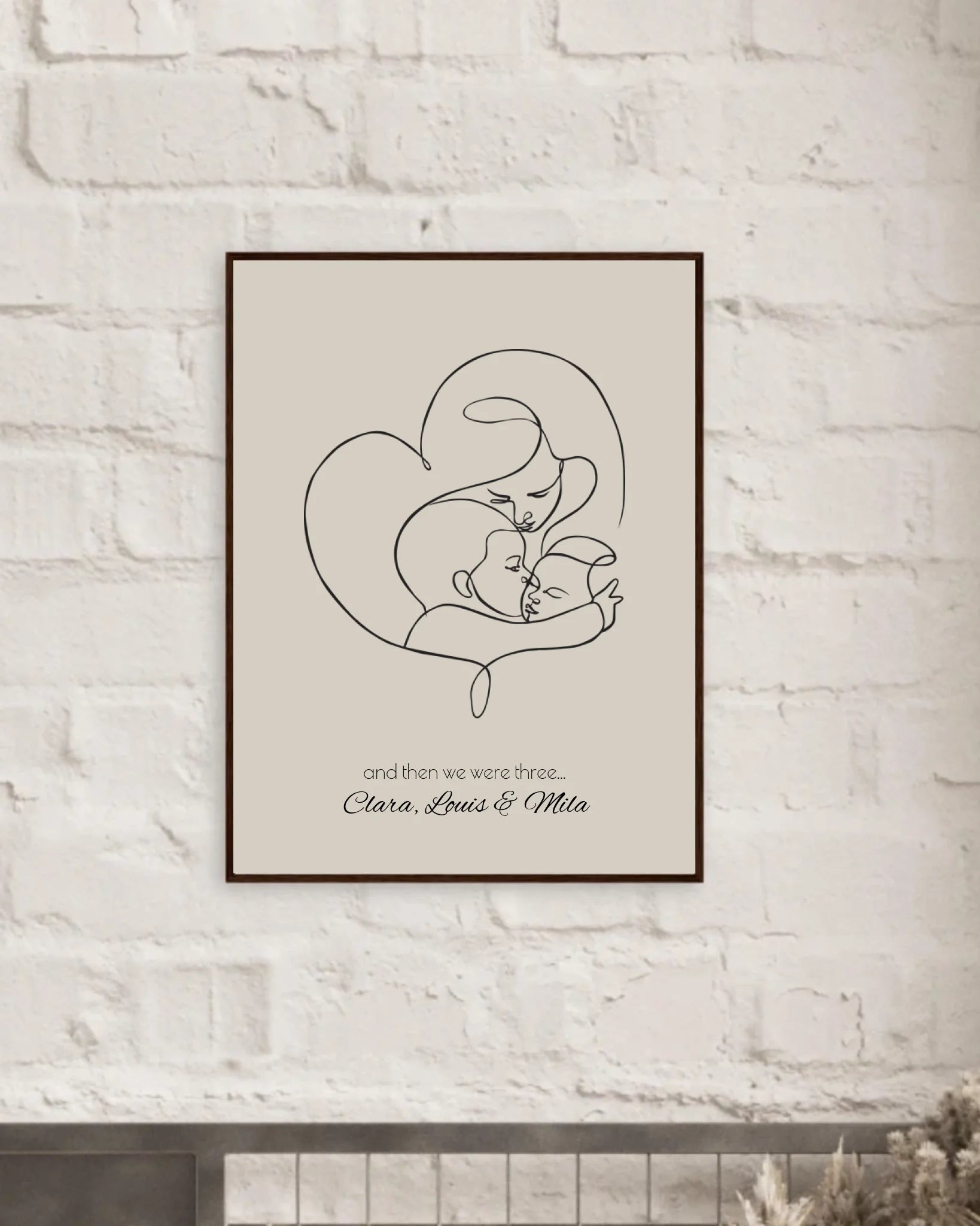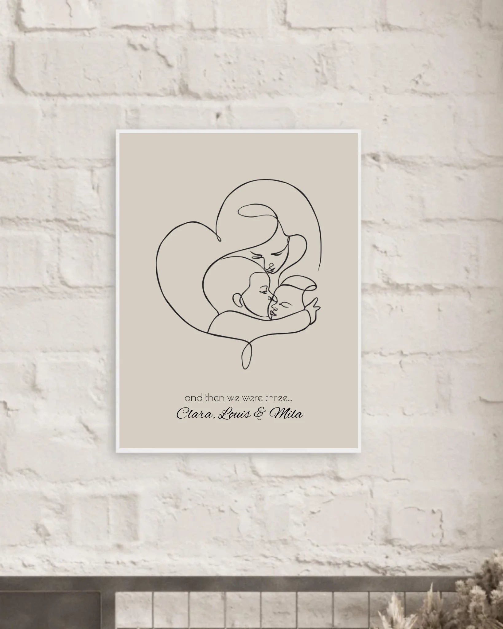 Dieses liebevoll gestaltete Poster zeigt eine innige Szene zwischen Mutter und zwei Kindern - reduziert auf das Wesentliche, aber voller Emotionen. Mit nur einer Linie gezeichnet, symbolisiert dieses Fineline-Motiv den Beginn einer kleinen Familie - stilvoll und modern.