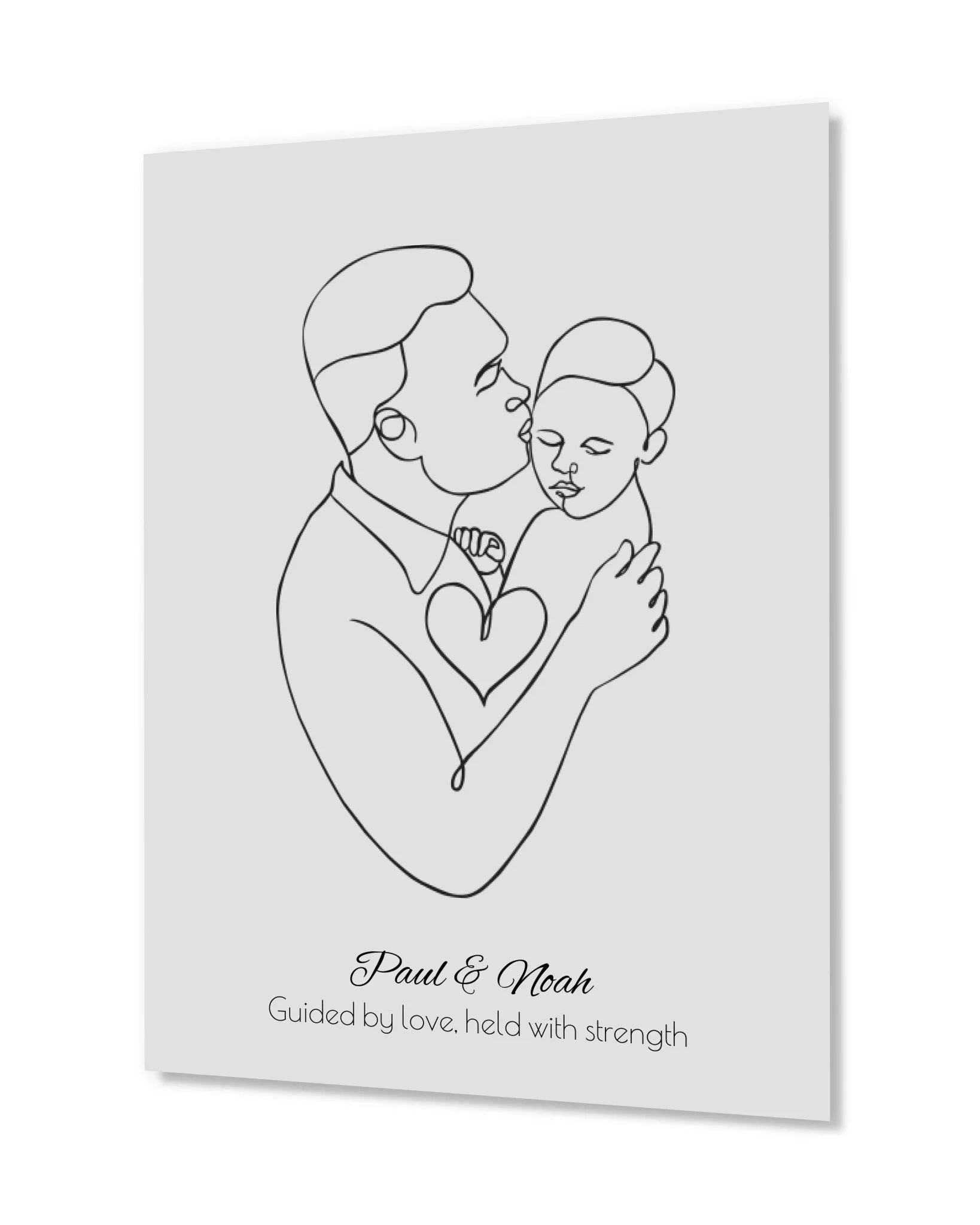 Dieses liebevoll gestaltete Fineline-Poster zeigt einen emotionalen Moment zwischen Vater und Kind - ein inniger Kuss, gehalten in minimalistischer Linienkunst. Ein Symbol für Schutz, Nähe und bedingungslose Liebe.