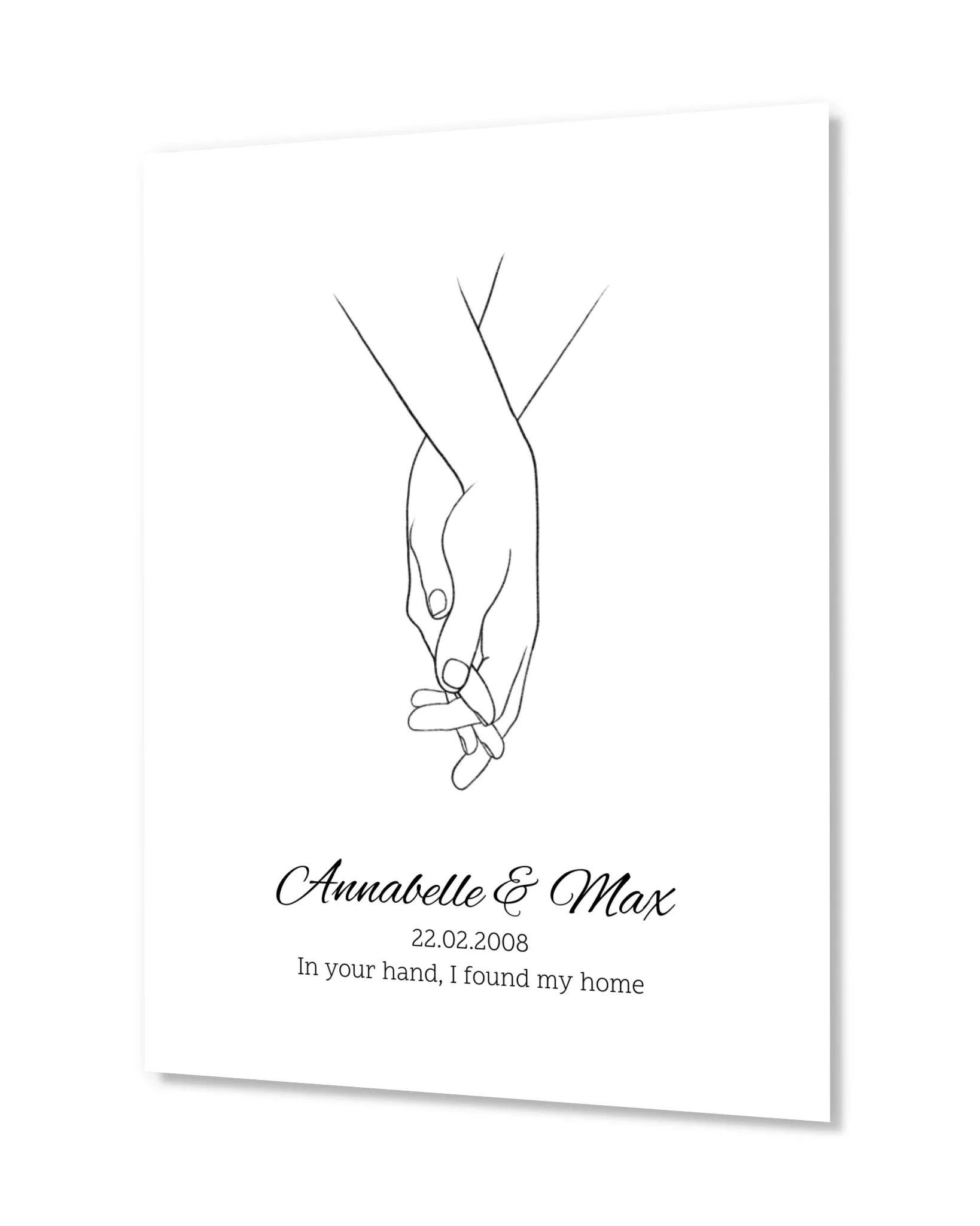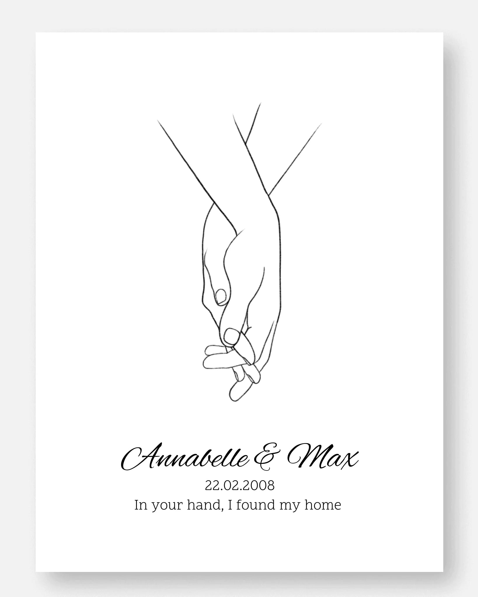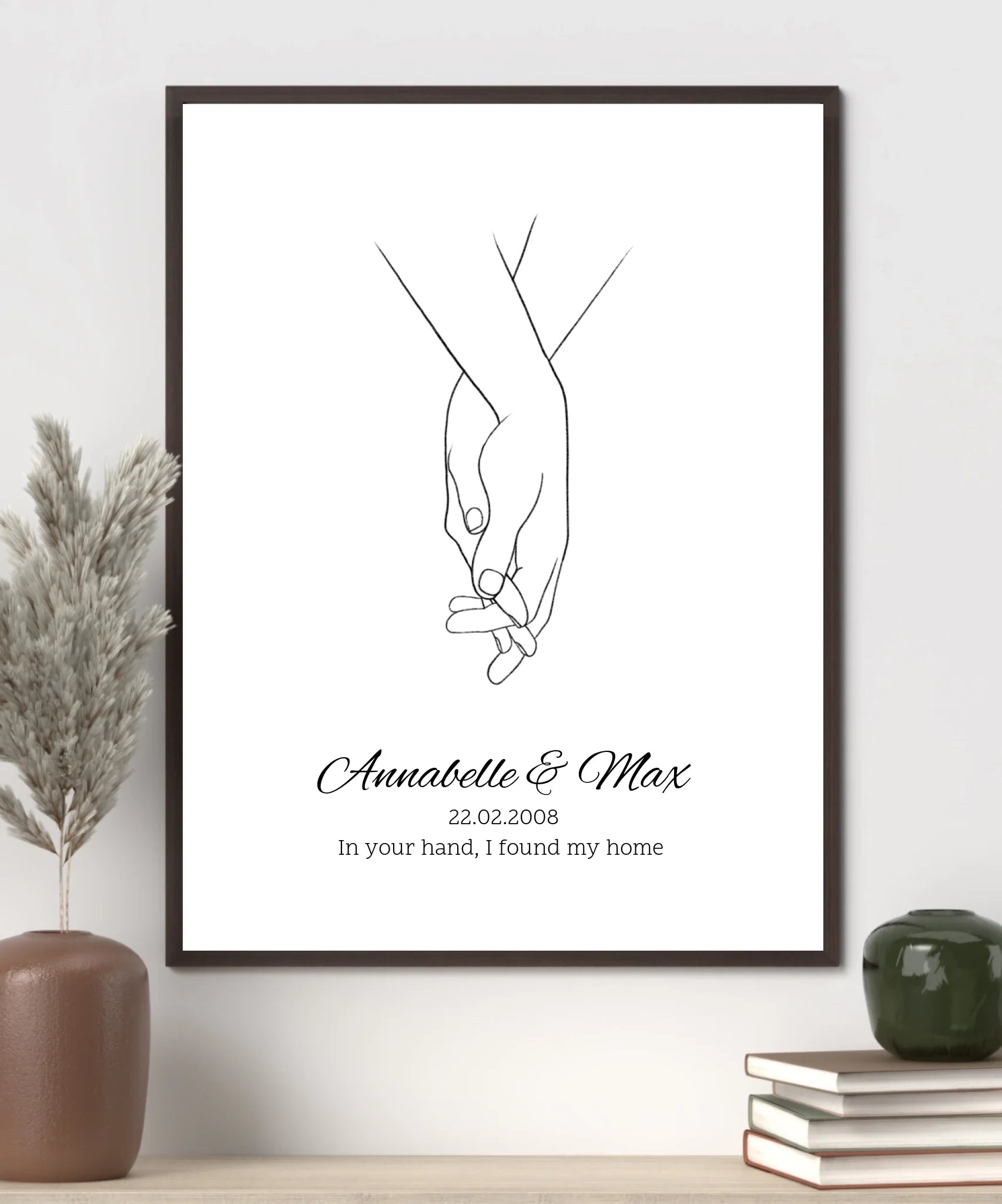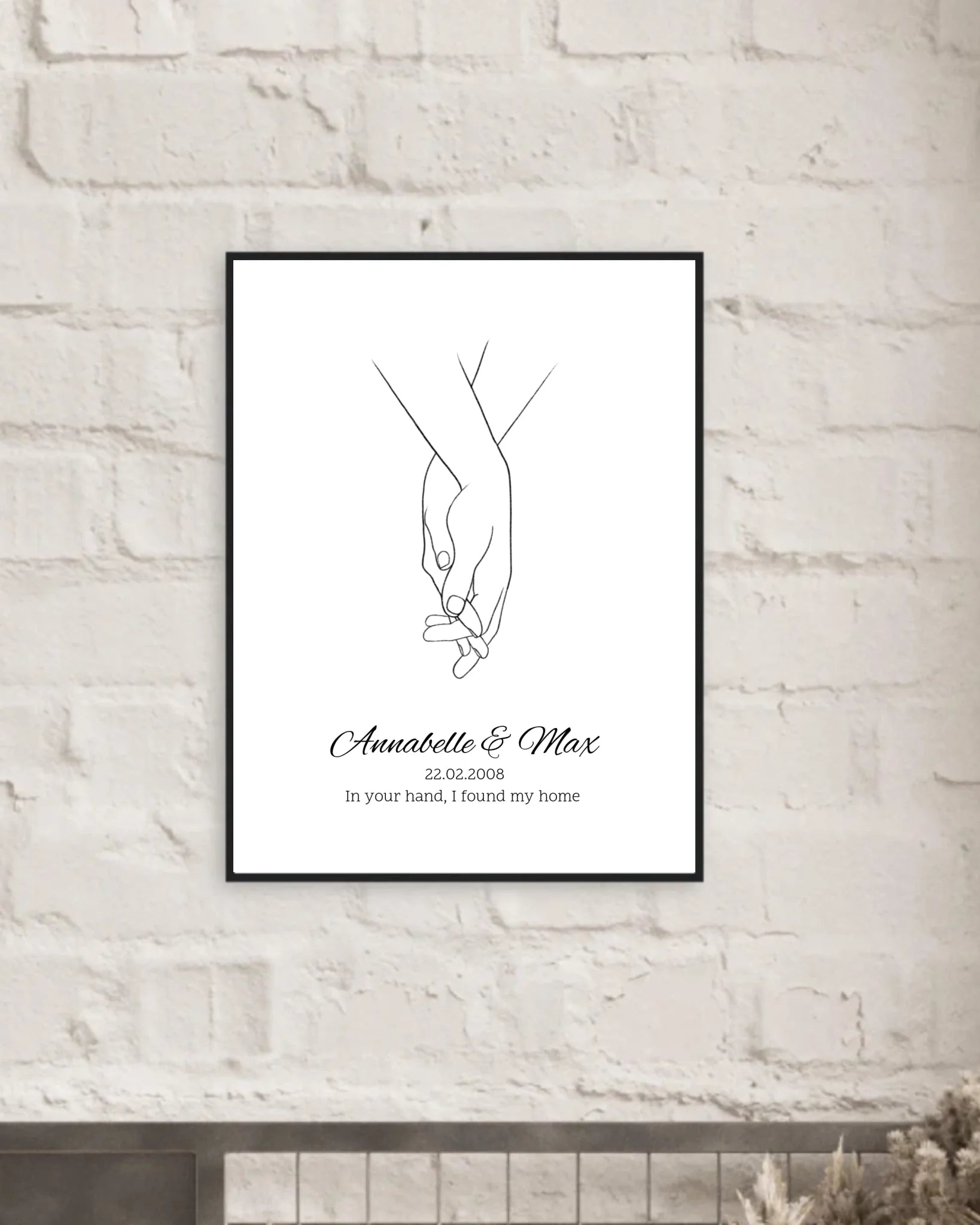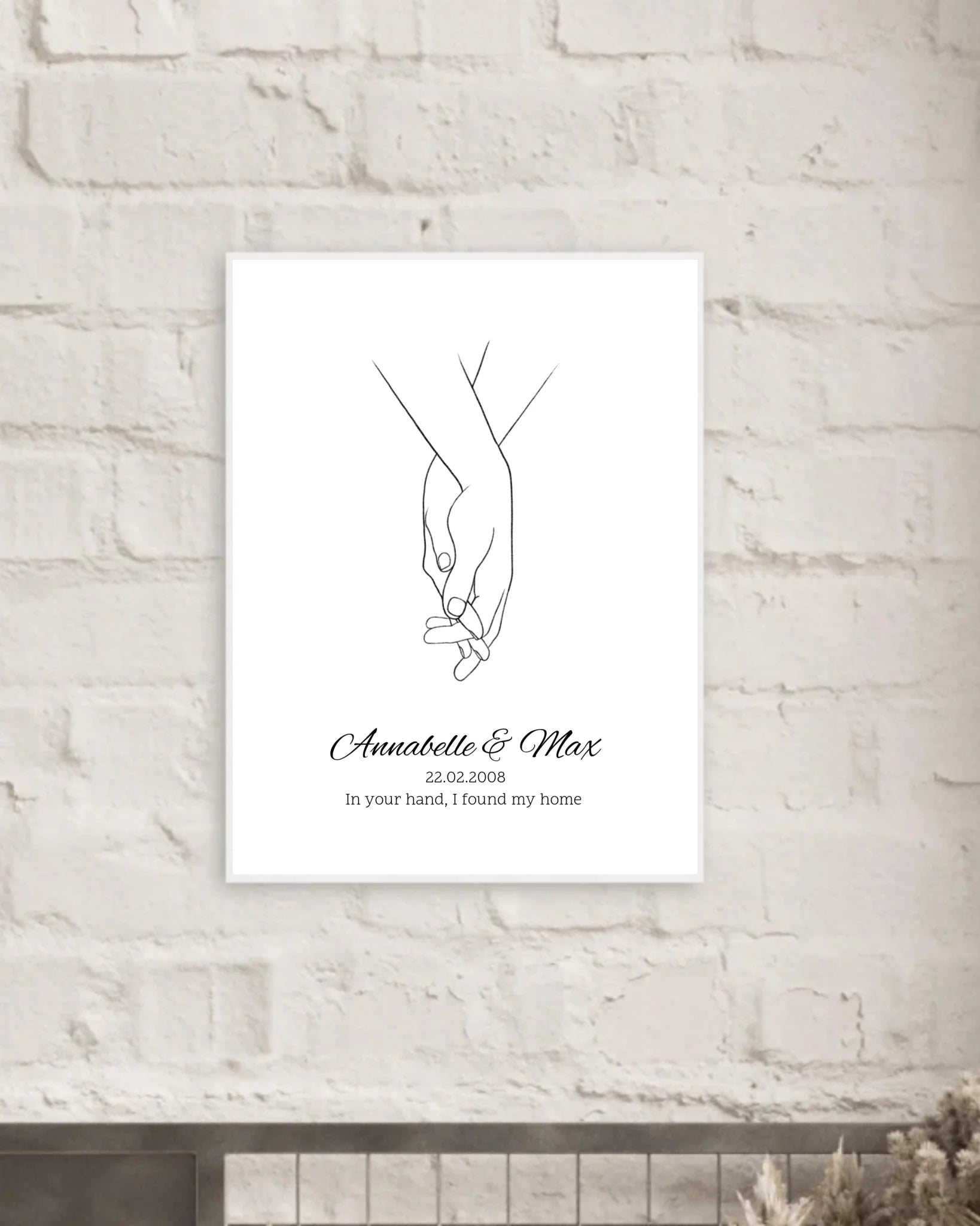 Das Fineline-Poster „Hand in Hand“ ist ein stilvolles Geschenk zur Hochzeit, zum Jahrestag, Valentinstag oder als liebevolle Erinnerung an eure gemeinsame Reise. Ein zeitloses Symbol der Liebe für euer Zuhause.