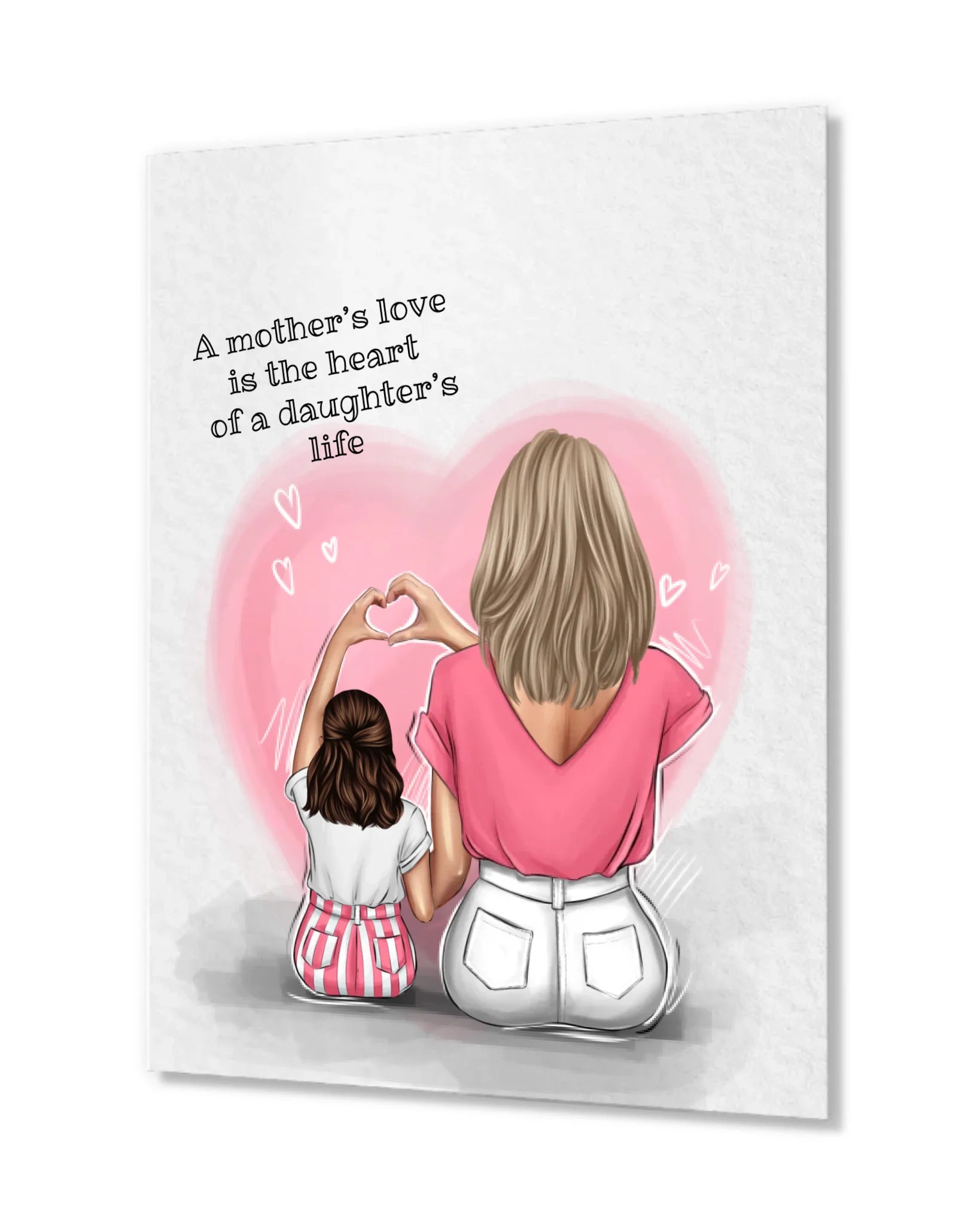 Das Motiv zeigt Mutter und Tochter von hinten, wie sie gemeinsam ein Herz formen. Der zarte rosa Herz-Hintergrund unterstreicht die innige Verbindung und macht das Poster zu einem liebevollen Symbol eurer Beziehung.