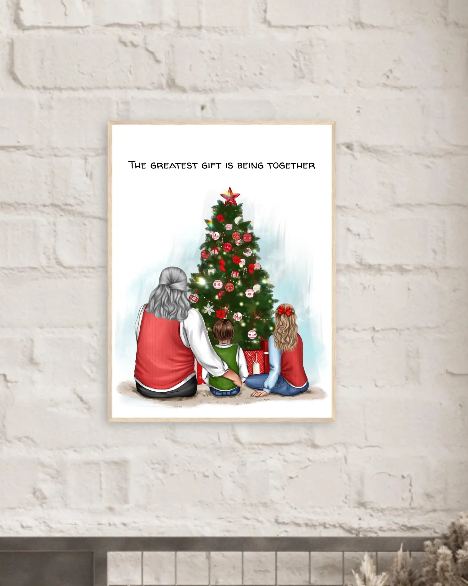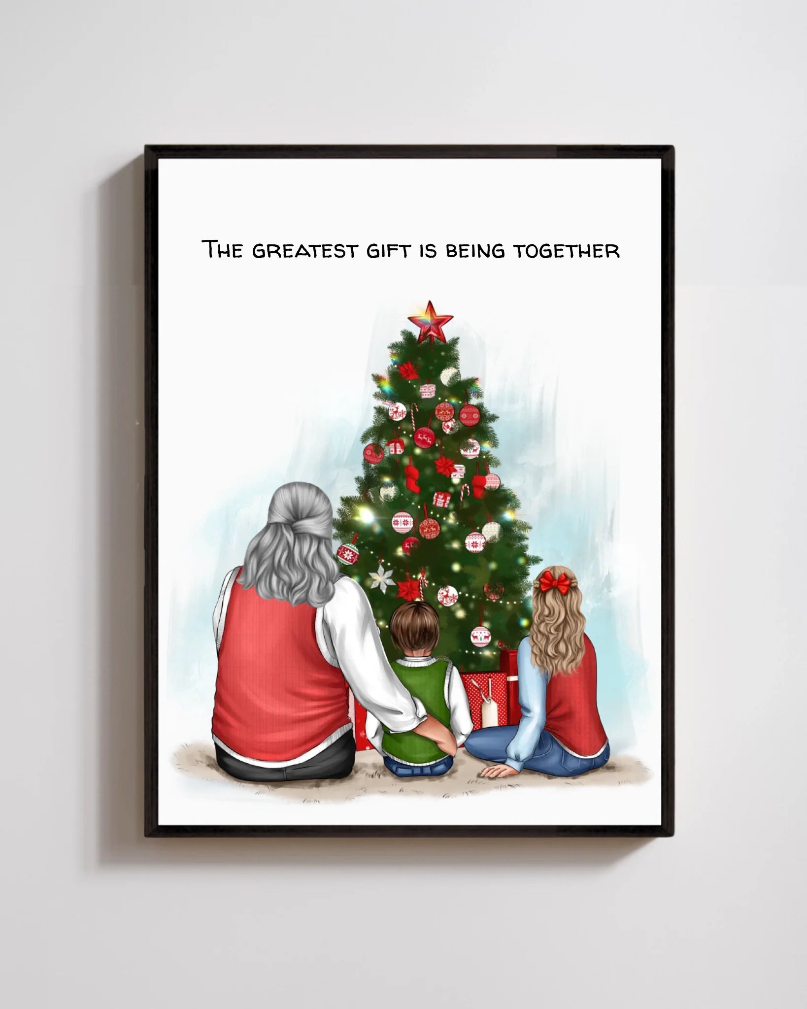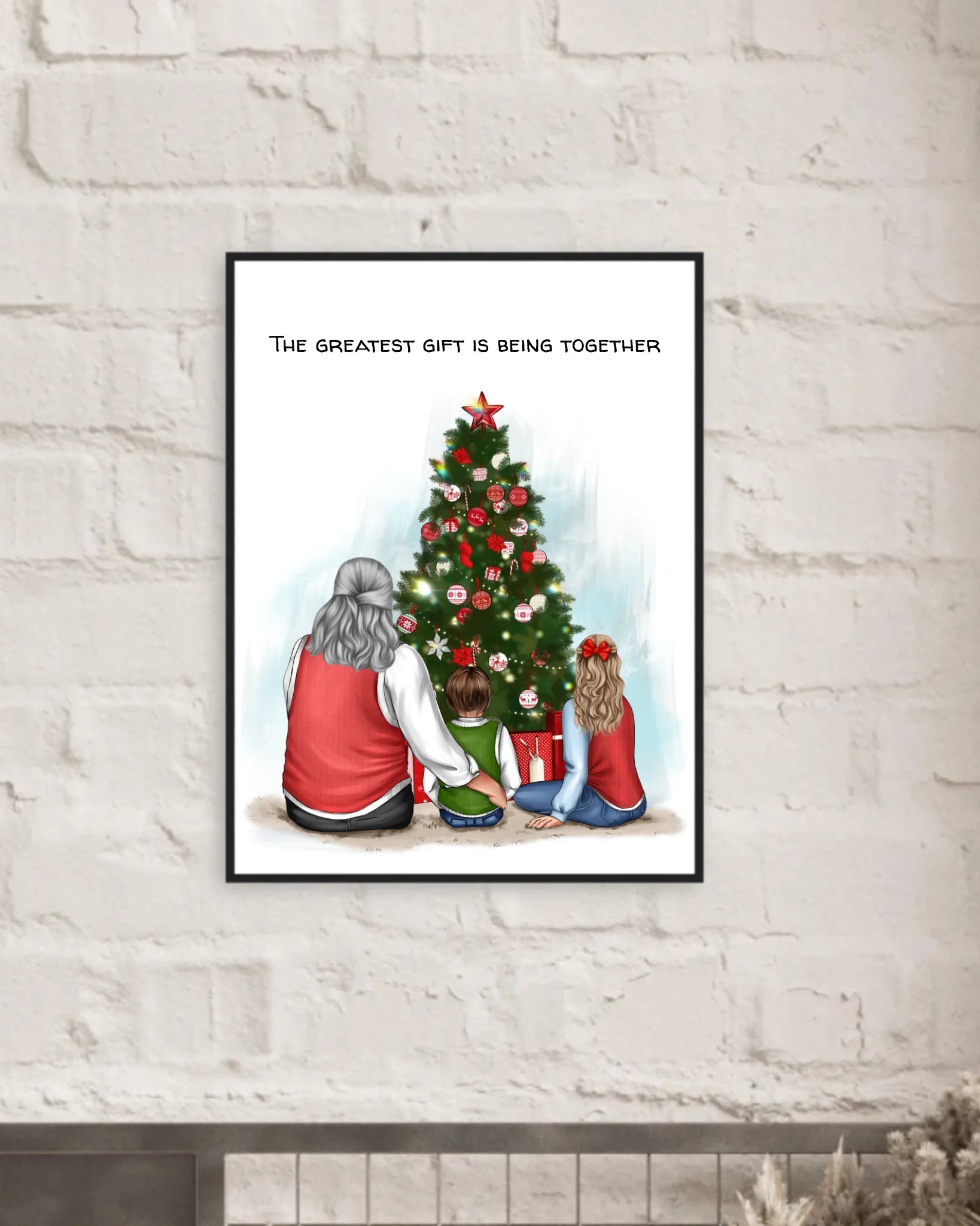 Weihnachten ist die schönste Zeit, um gemeinsam Momente zu teilen. Dieses liebevoll gestaltete, personalisierte Poster zeigt eine Oma mit ihren Enkelkindern, vereint vor einem festlich geschmückten Weihnachtsbaum. Der berührende Spruch „The greatest gift is being together“ erinnert daran, dass Zusammenhalt und Liebe das größte Geschenk sind.