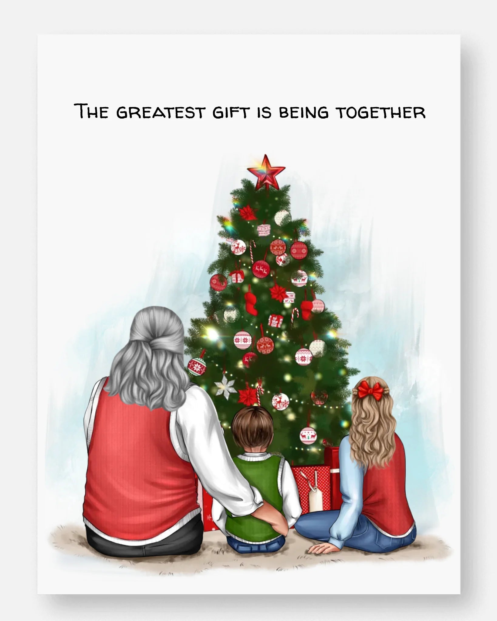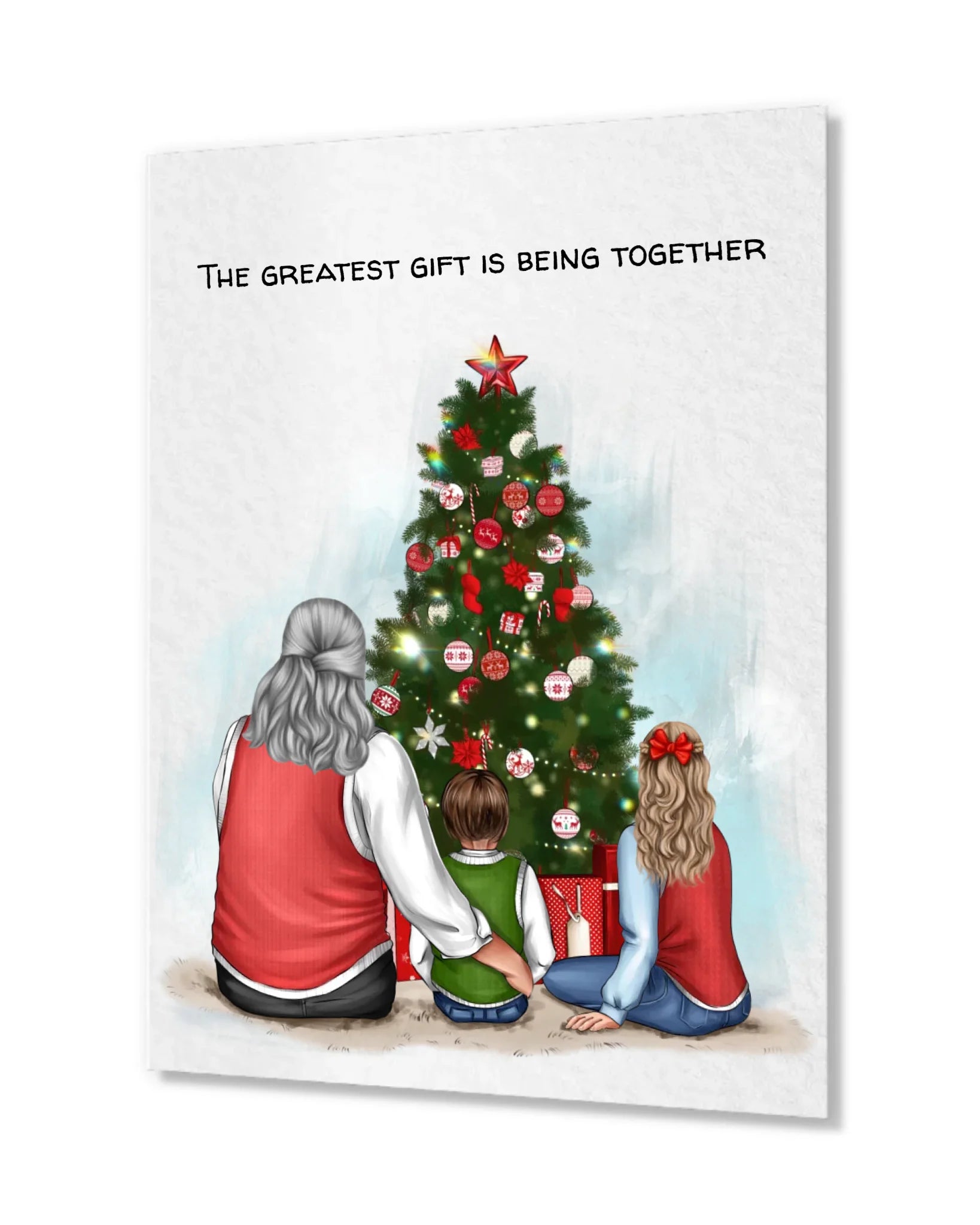 Das Motiv zeigt eine liebevolle Szene: Eine Oma mit ihren Enkelkindern, gemeinsam vor einem festlich geschmückten Weihnachtsbaum. Der Spruch „The greatest gift is being together“ erinnert daran, dass Zusammenhalt und Liebe das größte Geschenk sind.