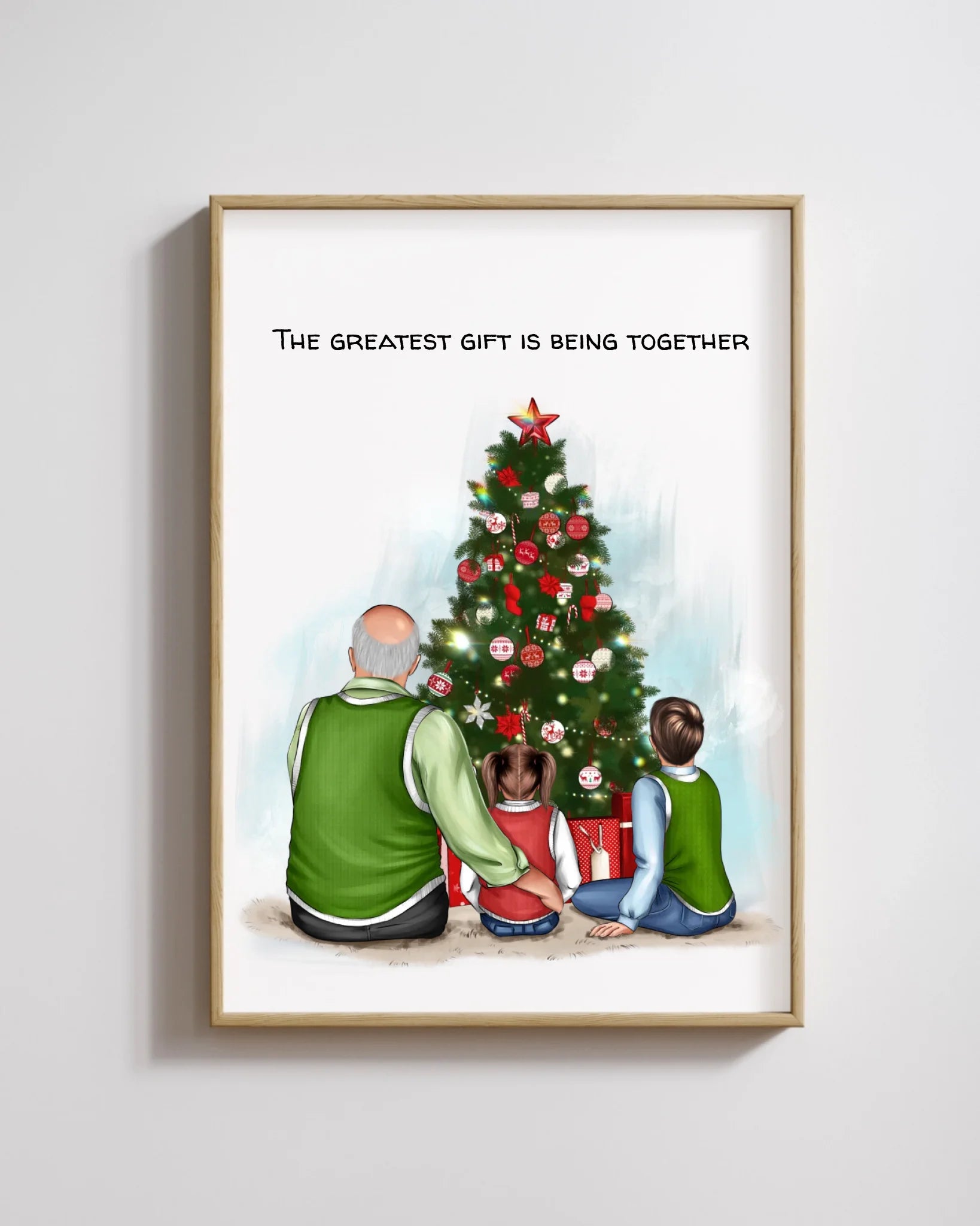 Das schönste Geschenk ist gemeinsame Zeit - besonders zu Weihnachten. Dieses liebevoll gestaltete, personalisierte Poster zeigt Großvater mit sienen Enkelkindern, die vereint vor einem festlich geschmückten Weihnachtsbaum sitzt. Der Schriftzug „The greatest gift is being together“ bringt auf den Punkt, was wirklich zählt: Zusammenhalt, Liebe und gemeinsame Erinnerungen.