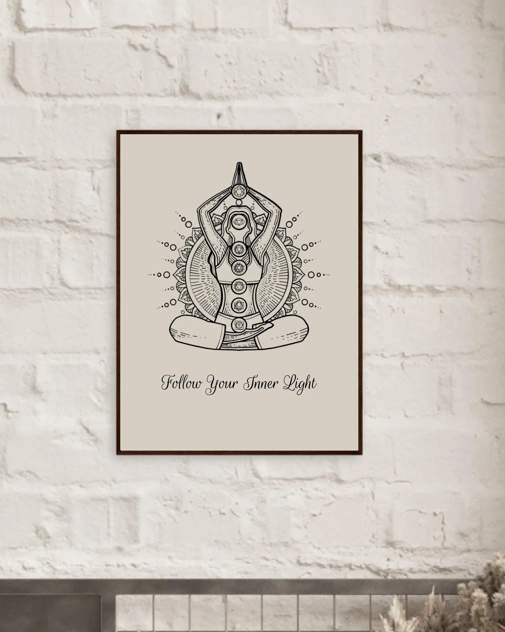 Dieses kunstvoll gestaltete Yoga-Poster zeigt eine meditierende Figur mit ausbalancierten Chakren und verbindet spirituelle Symbolik mit zeitlosem Design. Die feinen Linien und die ruhige, erdige Farbgebung schaffen eine harmonische Atmosphäre, die zur inneren Einkehr, Achtsamkeit und Balance einlädt. Ideal für Yoga-Räume, Meditationsbereiche oder als stilvoller Akzent in deinem Zuhause.